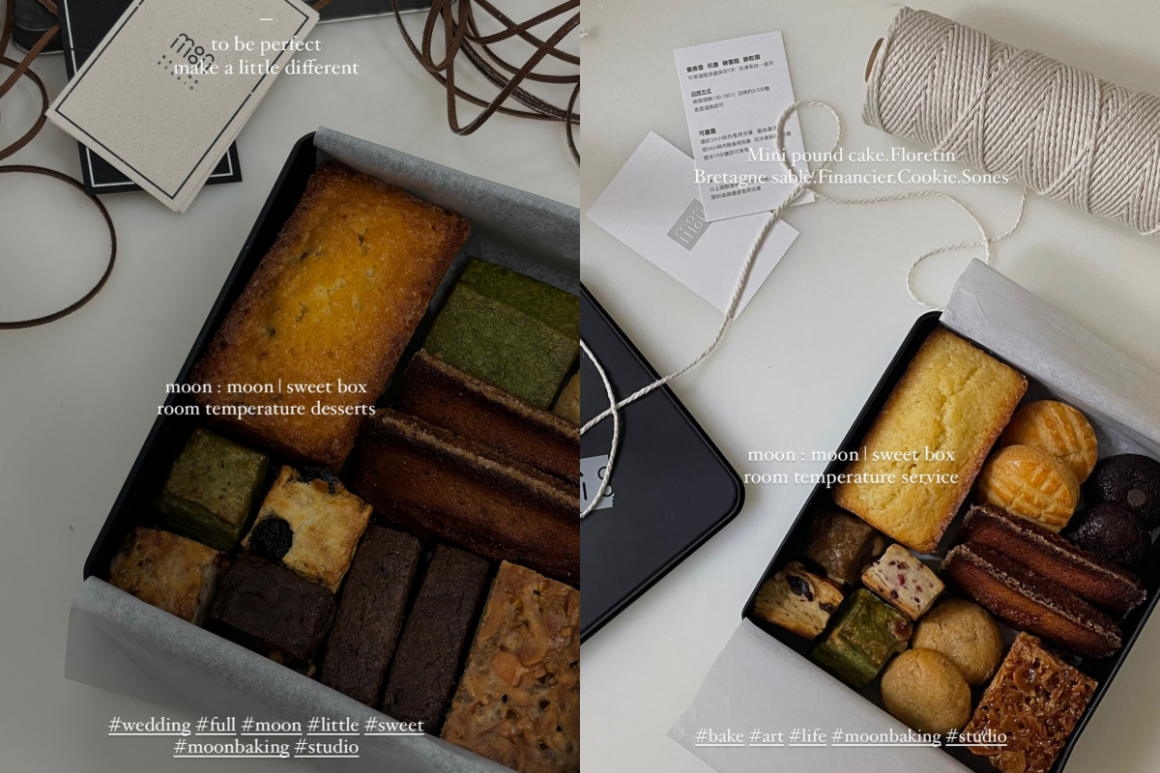 台北人氣烘焙品牌——Moon Baking studio,以歐式麵包結合月式風格,突破傳統型的甜點。其中的人氣品項:可麗露、磅蛋糕更是人氣熱賣款。Moon Baking studio 從設計包裝到烘焙糕點,以高顏值的視覺及美味並存,帶給新人最精緻的喜餅禮盒!