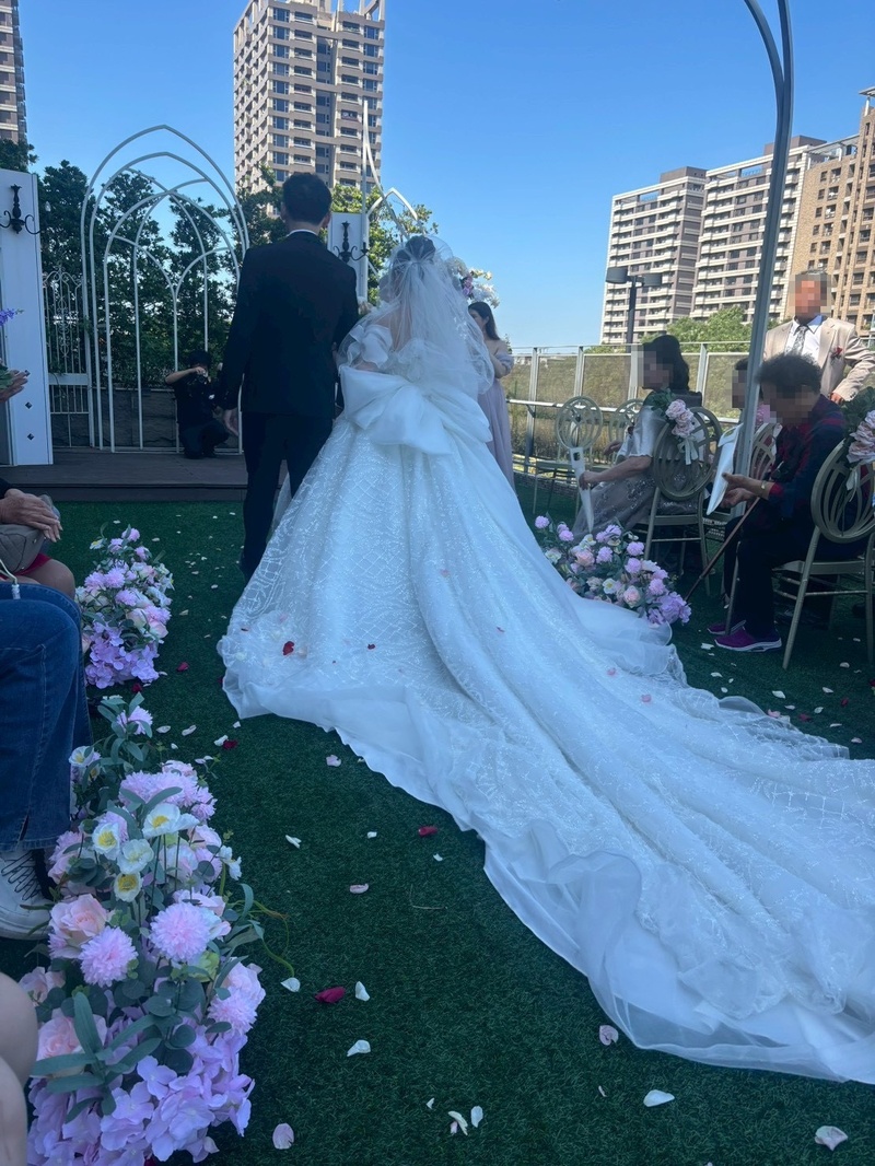 這真的是很真心的心得,對於不走傳統訂婚迎娶的新人,西式證婚也一樣很浪漫很感人!!彭園證婚不比其他間場地大,但費用相對也沒那麼高,還提供電動泡泡機跟氣球超浪漫,我覺得CP值很高了,彭園證婚還有一個好處是當賓客坐滿位置,會擋到風的阻力,地花比較不容易被吹倒哈哈,我參加過的戶外證婚在儀式過程中因為場地大風很大地花一直吹倒我扶了超多次,因為怕攝影拍到倒地的地花很難看,但也不是每個人都會扶我就覺得蠻可惜,所以我本來也很擔心我證婚過程地花會倒,但沒想到當天坐滿人後整個儀式過程都沒倒!!再來彭園每廳都很高挑大氣,低消跟其他家比起來我覺得也不會比想像中高,菜色回饋也不錯,最重要的是寵物友善,我可以讓自己家的狗狗來參與人生大事真的是太高興了,她那天到處跟著我家人走動不會亂跑也不會隨地大大尿尿,是個完全可以落地的乖狗狗,彭園的工作人員和賓客都一直來找她玩跟拍她,我可以跟她一起穿婚紗合照真的是太太開心了,謝謝業務席拉、婚企Mina、小管家yoyo、音控老師每位都很給力,過程也都一直安撫我們讓我們很放心,聽說證婚很難訂,我能訂到證婚真的太值得啦~謝謝彭園完成我們的婚姻大事,大推推🥰