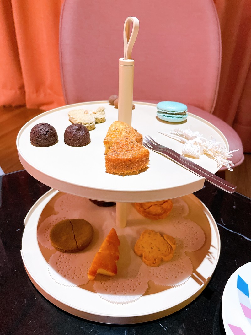 高腳雙層甜點盤,擺滿一個個甜點,再搭配一杯熱紅茶,整個下午茶氛圍瞬間拉滿,每一塊餅乾、蛋糕都很精緻、可口,吃之前就已經先被外觀療癒一波。