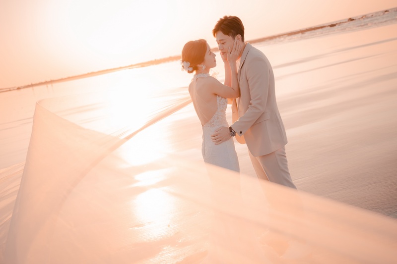 拍攝當天下午也運氣很好的出了太陽,一切都是那麼幸運,在老師們的默契配合,即便很有寒意的海邊也能順利如期結束拍攝,拍攝的結果也很滿意,五星評價獻給實至名歸的唯你婚紗!