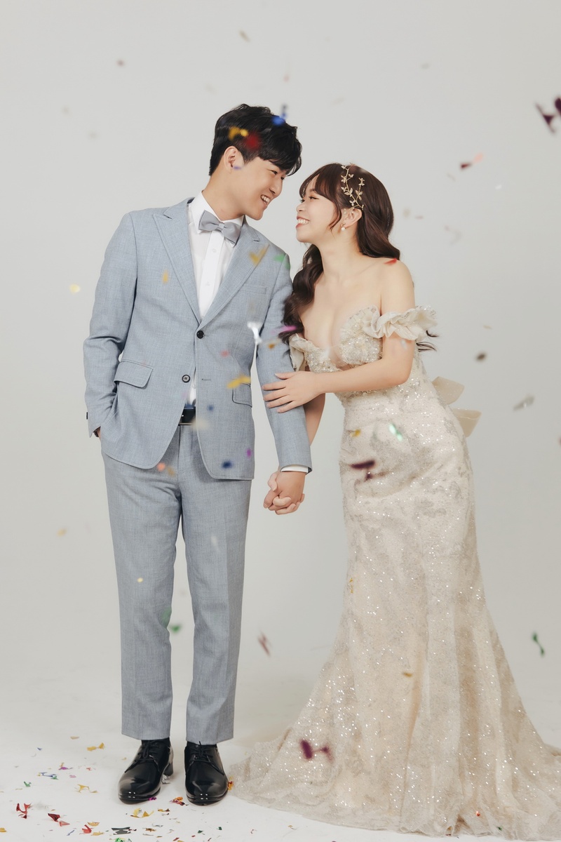 造型師-ELLY,提早到攝影棚把該用的工具都擺好等我們,妝髮是我喜歡的那種大波浪和白開水妝感,拍照過程也會一直給我信心,真的是一直給滿滿讚美和信心,幫忙注意NUBRA跟瀏海。換裝也是真的很迅速,只要當個快樂的新娘就好了。