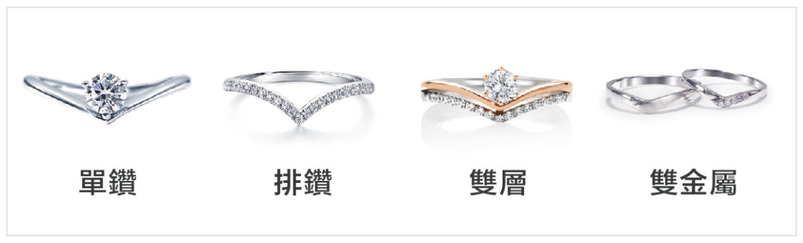 V型戒指的設計非常多元,光是戒臂就分成很多款式,有大部分新人知曉的單鑽、排鑽、雙層,還有近幾年廣受新娘喜愛的雙金屬!如果你也正在尋找V型戒指,快來看看以下的品牌和款式