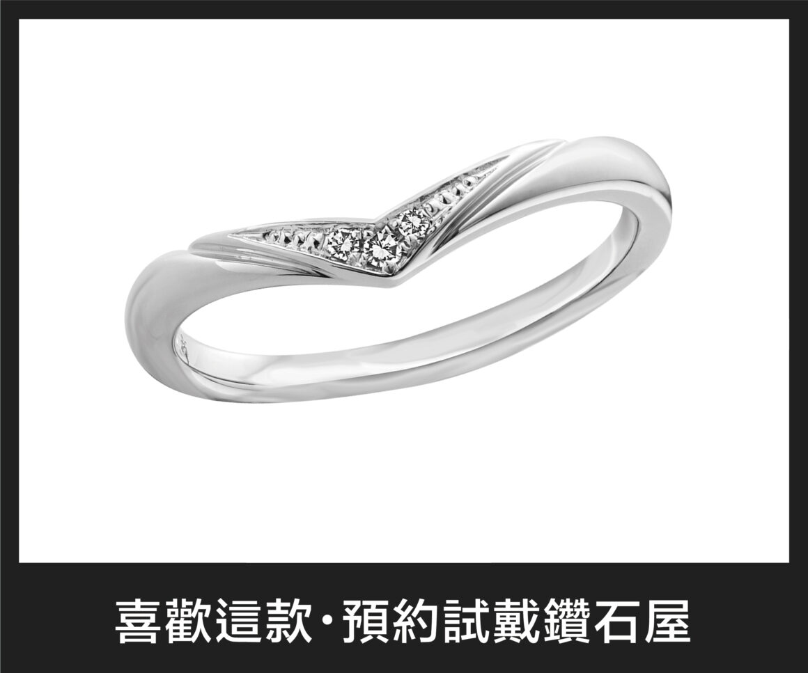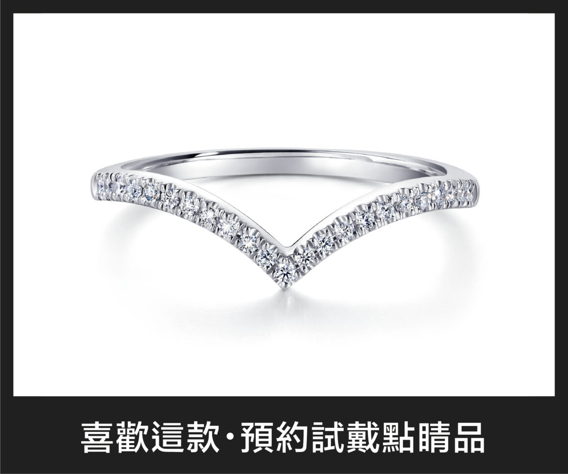 許多新人的婚戒首選都是V型的款式,因為V型的設計最能修飾手型,就像衣服選擇V領看起來顯瘦是一樣的道理,單戴一只有讓手指看起來較纖細修長的視覺效果,適合任何手指形狀的人,手指肉肉或較短的新人也不用擔心。