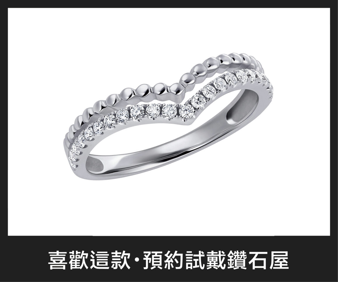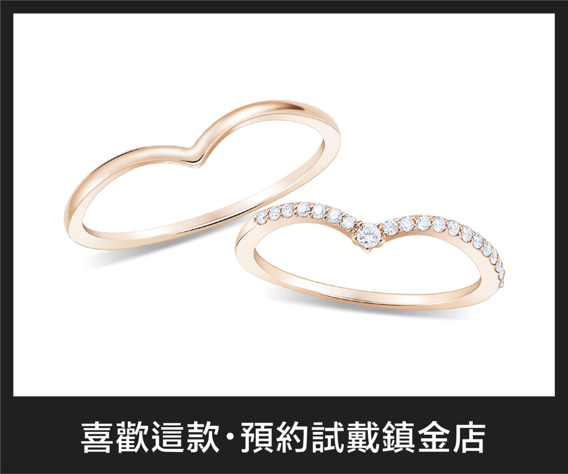 V型戒指還有一大特色,也是讓許多新娘堅持選擇V型戒款的原因「搭配任何戒指都百搭好看」,不管是搭配線戒或單鑽都能完美疊戴,畫龍點睛!
