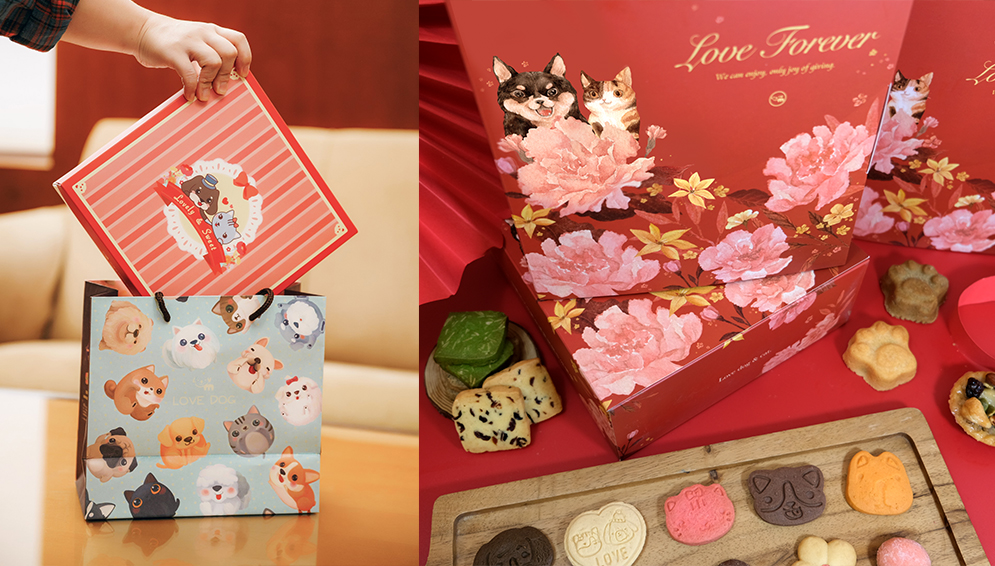 幸福狗的喜餅禮盒以毛小孩萌圖搭配喜氣紅作為設計,餅乾品項更以可愛的浪貓浪狗造型,展現出溫馨可愛的療癒喜餅禮盒。