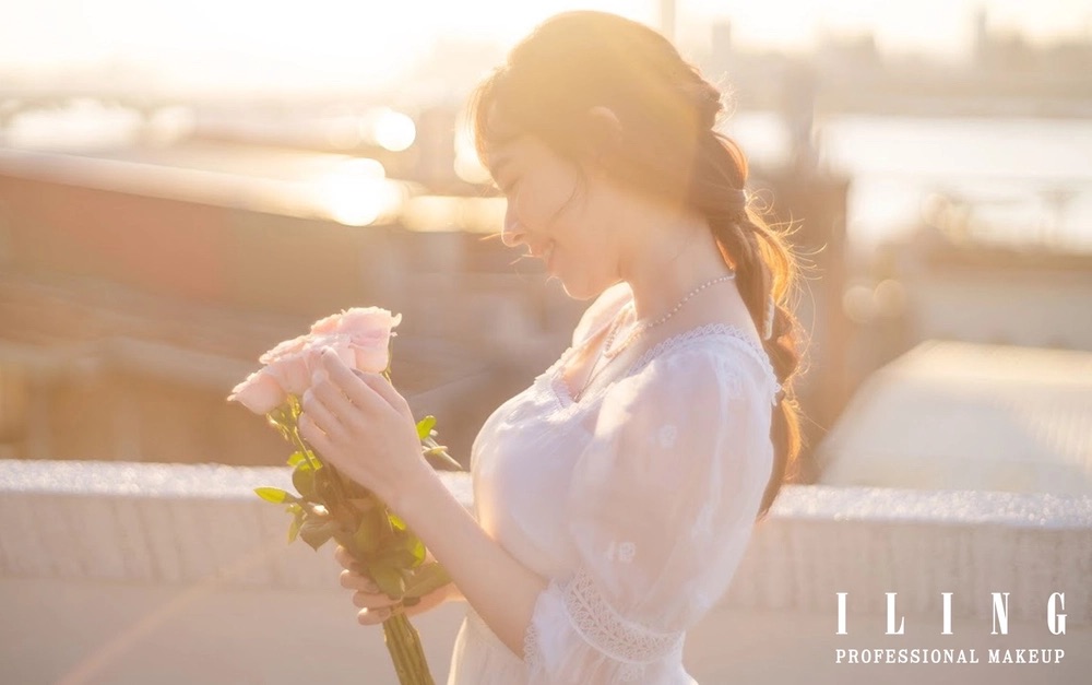 曾榮獲英國ELM Master認證,有著連續5年受邀為金鐘獎造型團隊的iLing新秘老師,主打「晶透玻璃妝容」強調水晶光透的肌膚質感!透過輕薄透亮的底妝搭配微光高光,打造出高級無瑕、透亮的精緻臉龐。iLing老師注重眼妝細膩感,柔和又具時尚感的眉型和水潤玻璃唇彩,使整體妝感清新高雅又精緻,即使在鎂燈光下,新娘也能展現出自然的光澤感,成為婚禮當天最具辨識度的高級妝容。