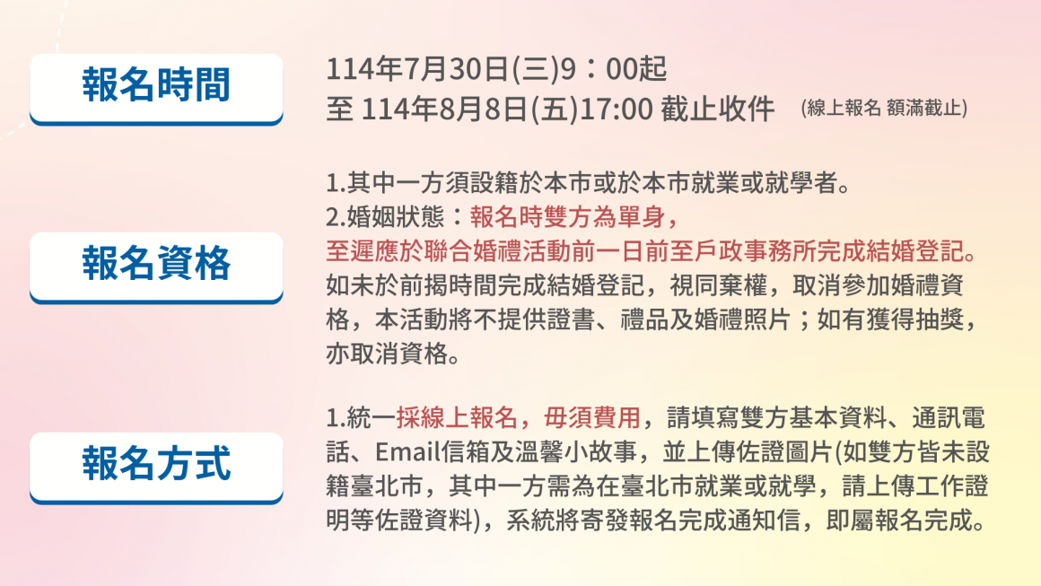 - 本年度聯合婚禮辦理日期、地點如有變更,另行於網站公告。