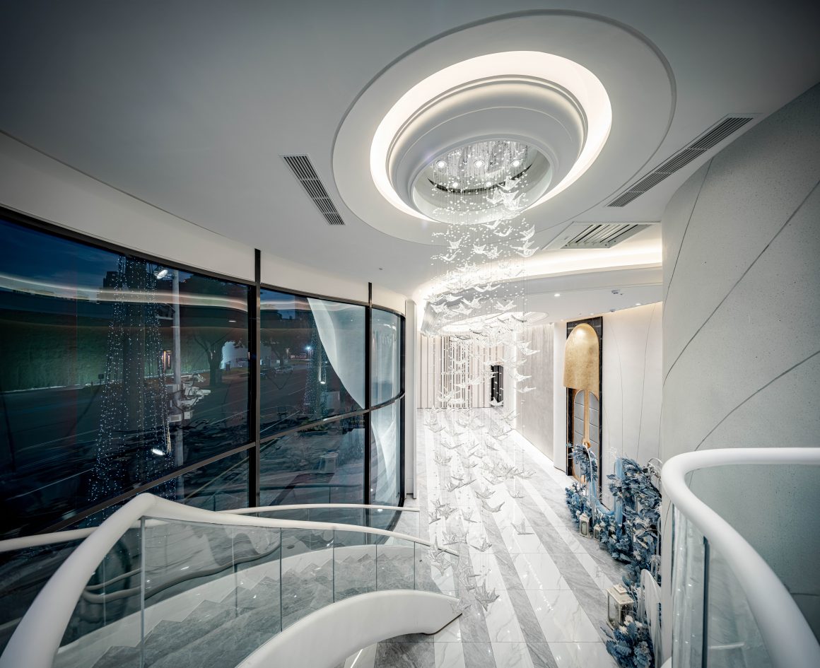 大廳內的挑高樓梯以優美曲線串連空間,行走其中,能感受到專屬婚禮的神聖與優雅,空間線條會隨著柔和的光影,在不同時間都能營造出獨特的浪漫氣息,使整體空間氛圍增添驚喜之處。邱德光設計師精心構思,讓光影沿著有機的曲線流動,像是新娘頭紗輕盈飄逸,讓「雅園新潮婚宴會」館無論白天黑夜,都成為市區裡一座醒目的藝術地標,靜靜見證並祝福每一場愛與幸福的誕生。