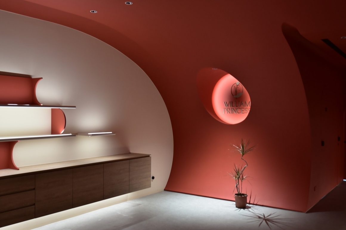 整體空間主色選用「磚紅 × 奶茶色」,磚紅象徵喜事與儀式感,帶來強烈視覺張力;奶茶色則溫潤柔和,展示櫃與牆面皆採用圓弧收邊設計,店內的每一盞燈光皆由專業設計師親自調光規劃,避免刺眼直射,消除視覺上的銳利感,讓空間氛圍顯得更溫馨舒適、有層次且具延展性。