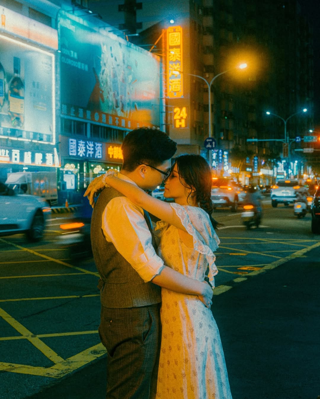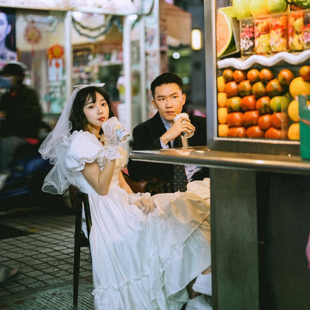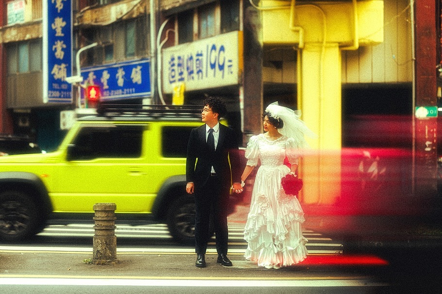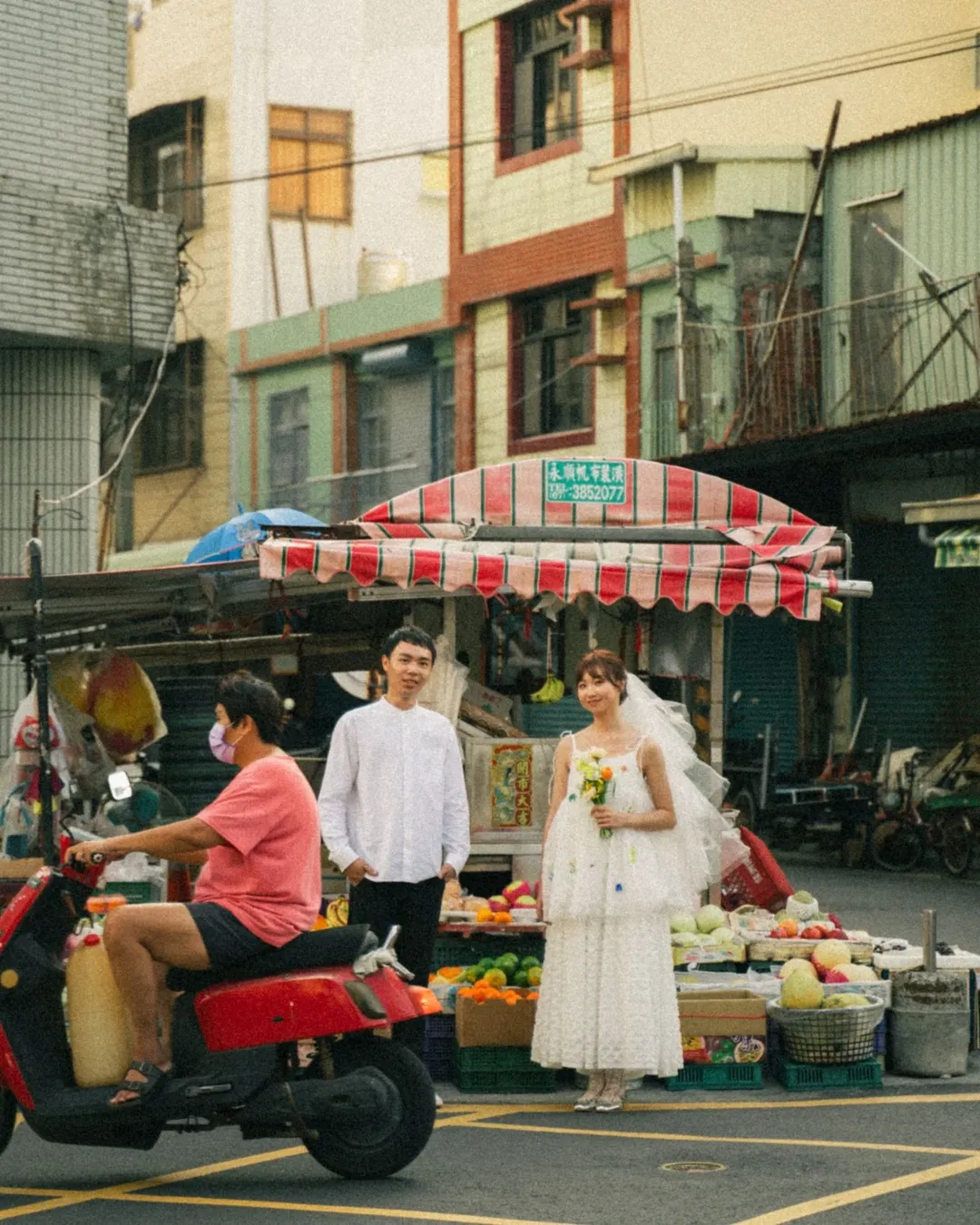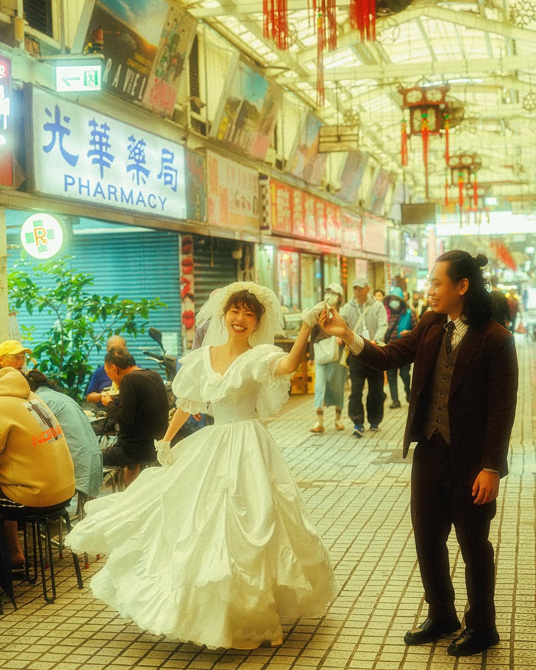 「懷舊但不老氣」就是台灣感性婚紗最迷人的調性。影像低飽和度,色調偏冷中帶暖,搭配光暈與柔焦的處理,呈現如夢似幻的柔霧朦朧感,讓畫面自然有復古氛圍。把老公寓的外牆、夜市裡的果汁攤、街角的菜市場等日常當作背景,讓新人與環境自然互動,融為一體,讓影像有種專屬台灣的生活感與人情味。