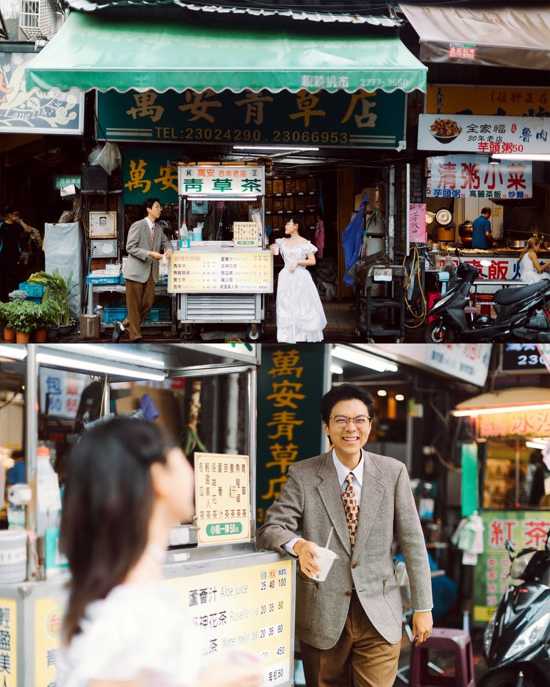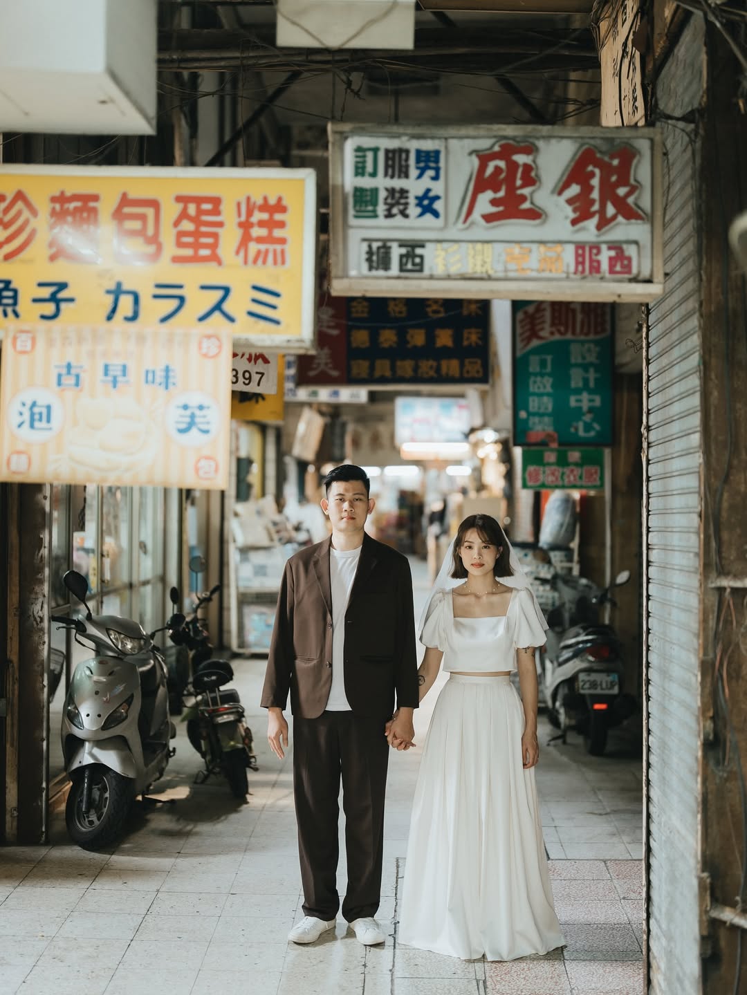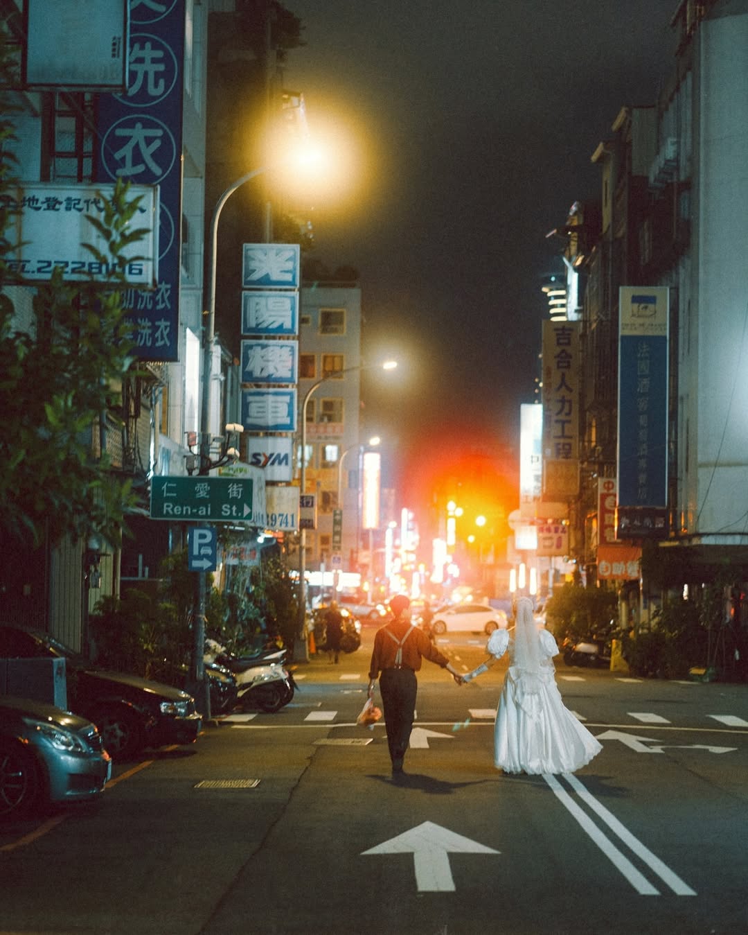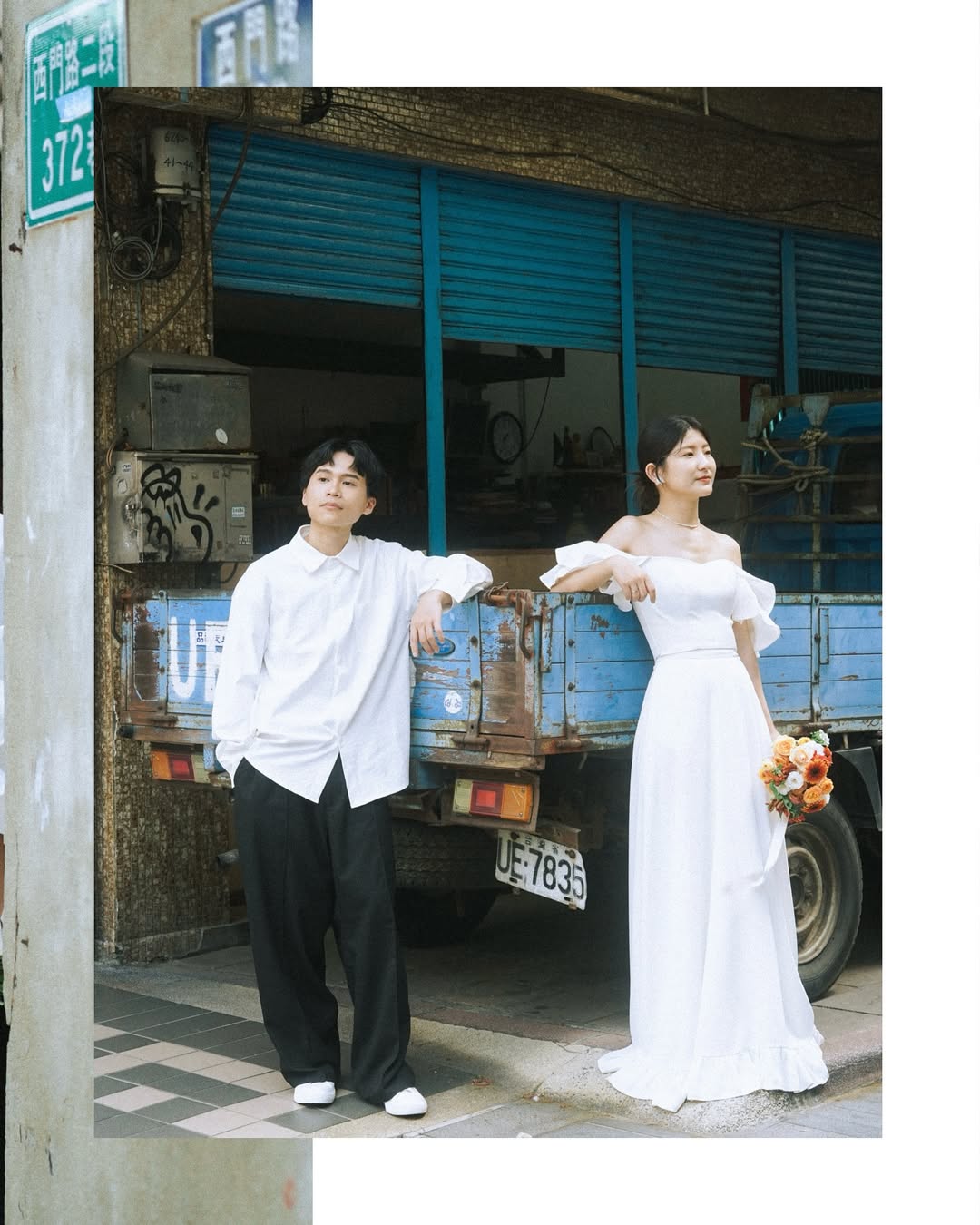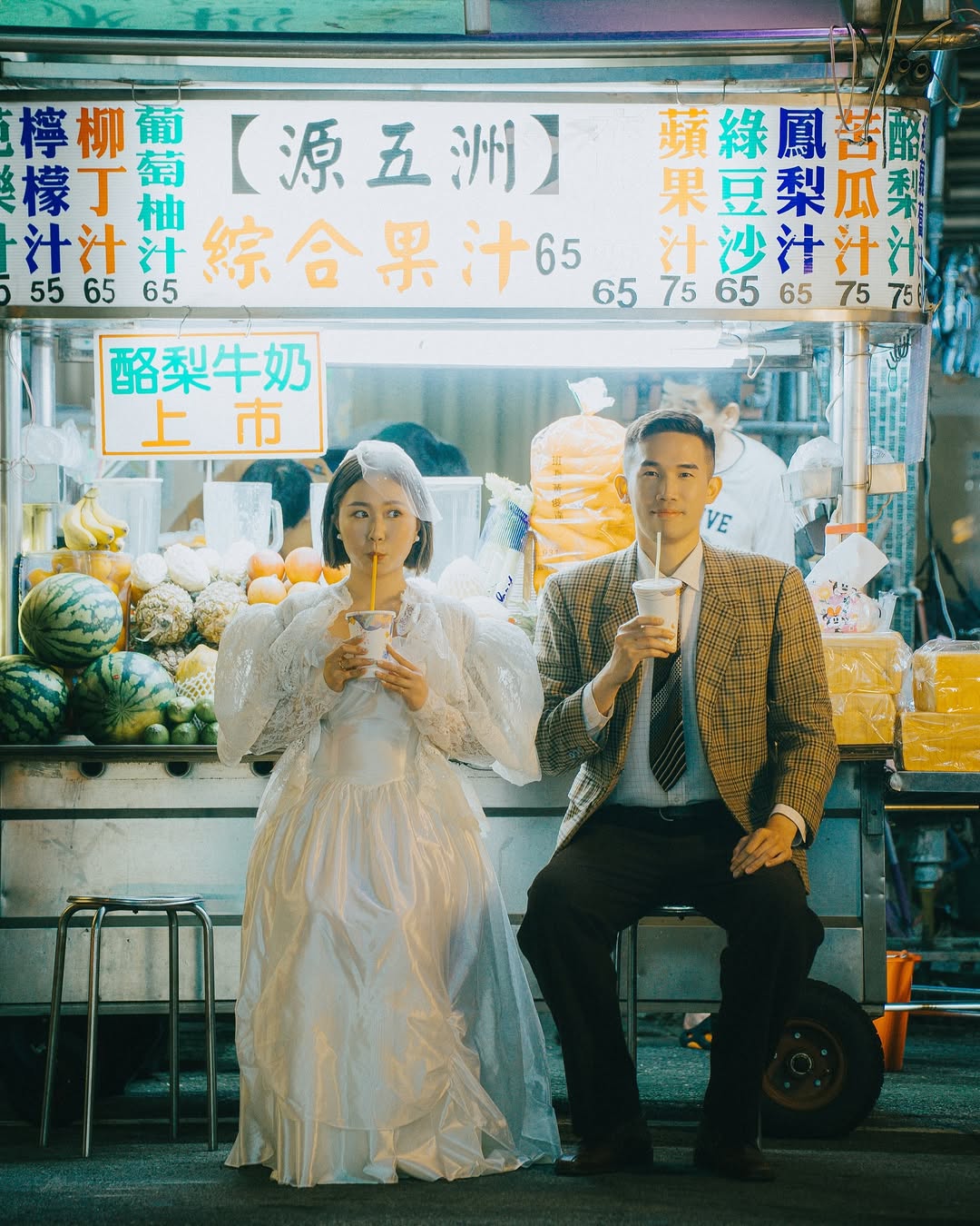 「懷舊但不老氣」就是台灣感性婚紗最迷人的調性。影像低飽和度,色調偏冷中帶暖,搭配光暈與柔焦的處理,呈現如夢似幻的柔霧朦朧感,讓畫面自然有復古氛圍。把老公寓的外牆、夜市裡的果汁攤、街角的菜市場等日常當作背景,讓新人與環境自然互動,融為一體,讓影像有種專屬台灣的生活感與人情味。