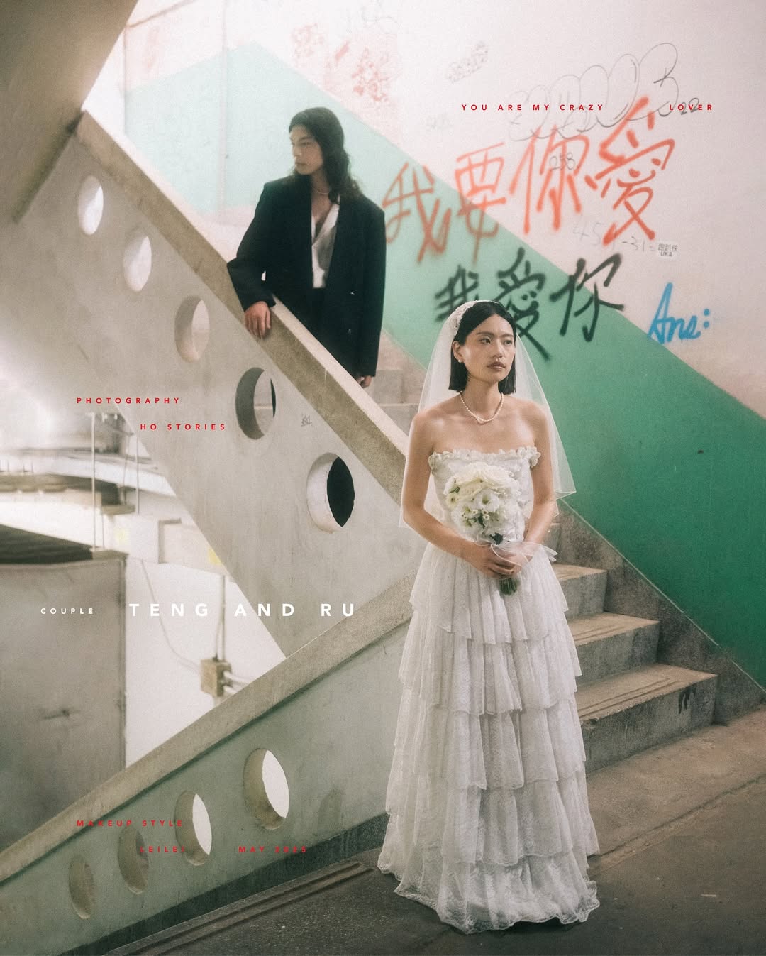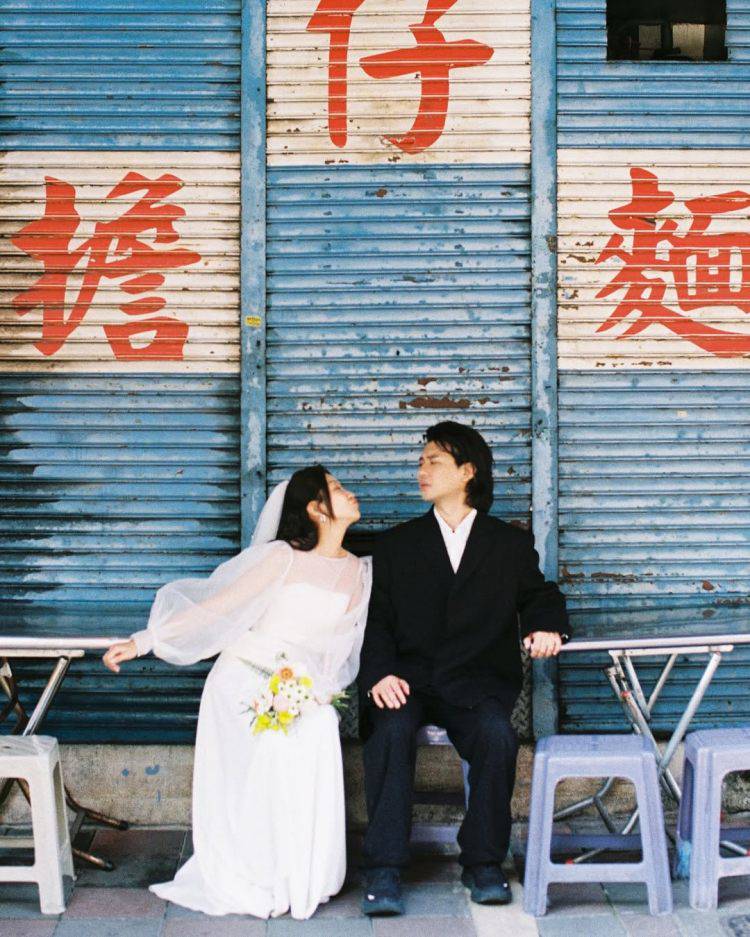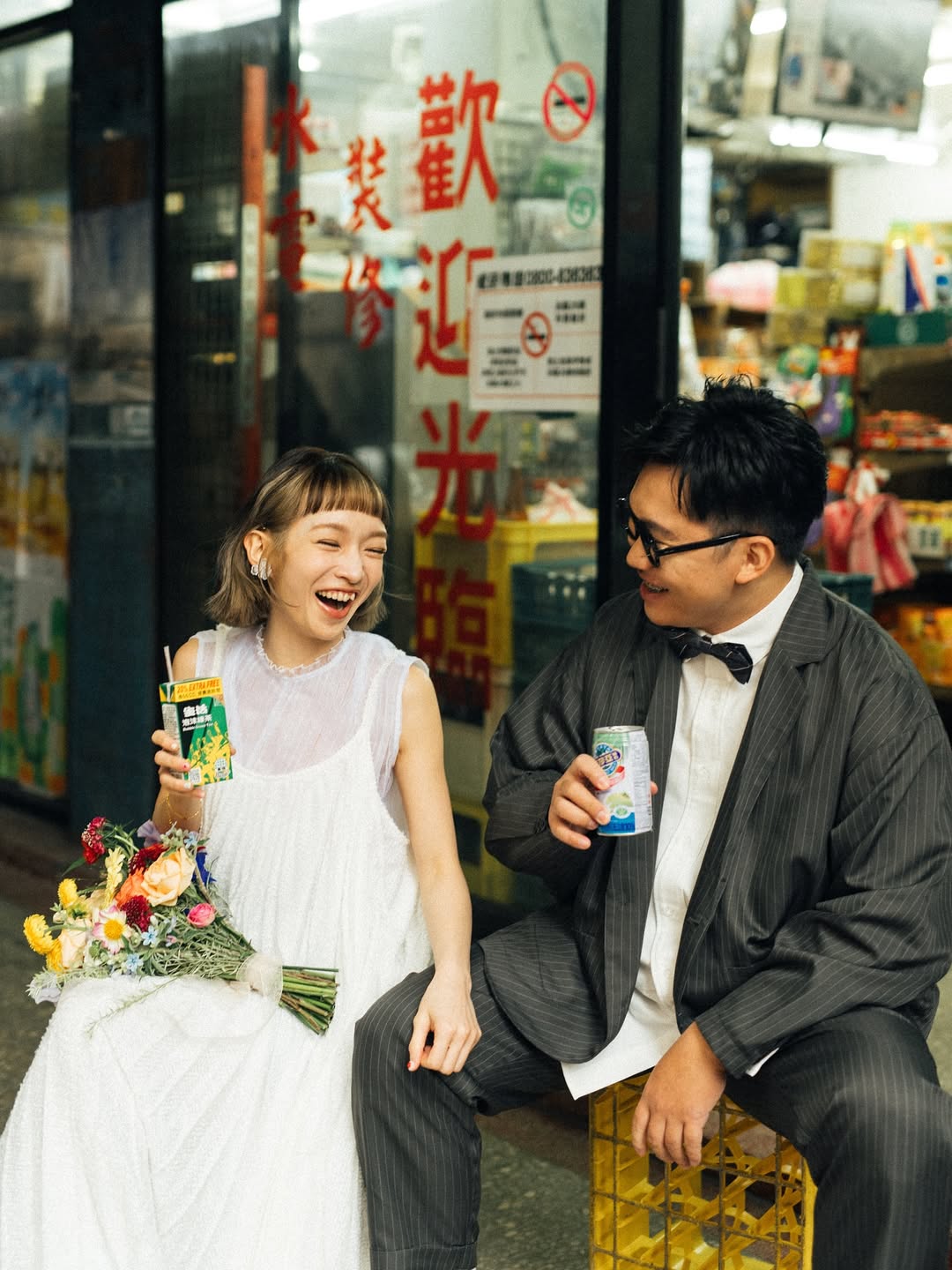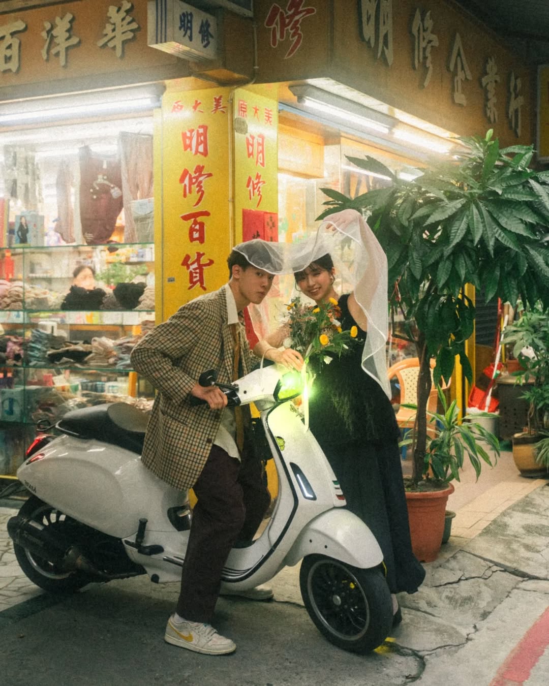 「懷舊但不老氣」就是台灣感性婚紗最迷人的調性。影像低飽和度,色調偏冷中帶暖,搭配光暈與柔焦的處理,呈現如夢似幻的柔霧朦朧感,讓畫面自然有復古氛圍。把老公寓的外牆、夜市裡的果汁攤、街角的菜市場等日常當作背景,讓新人與環境自然互動,融為一體,讓影像有種專屬台灣的生活感與人情味。