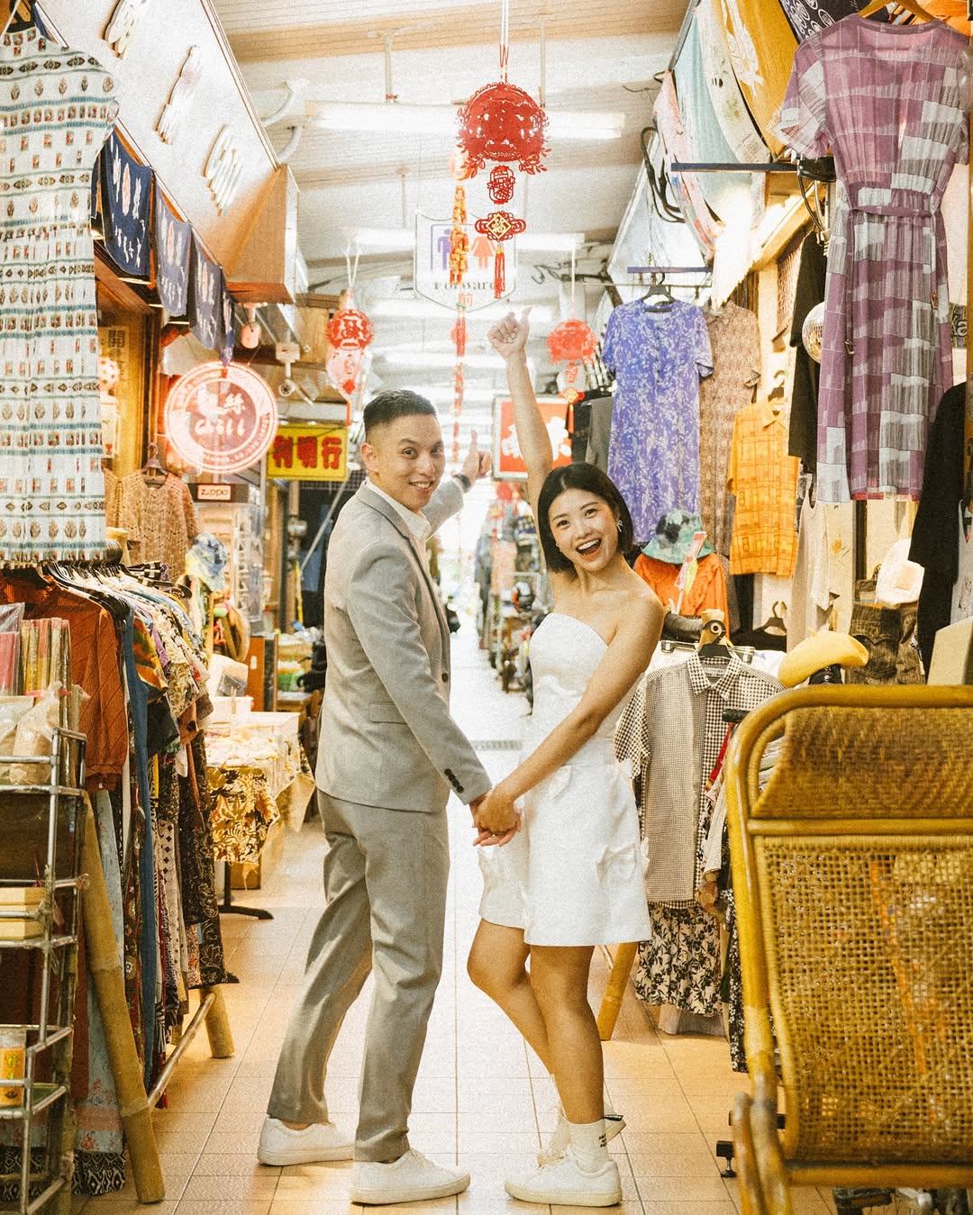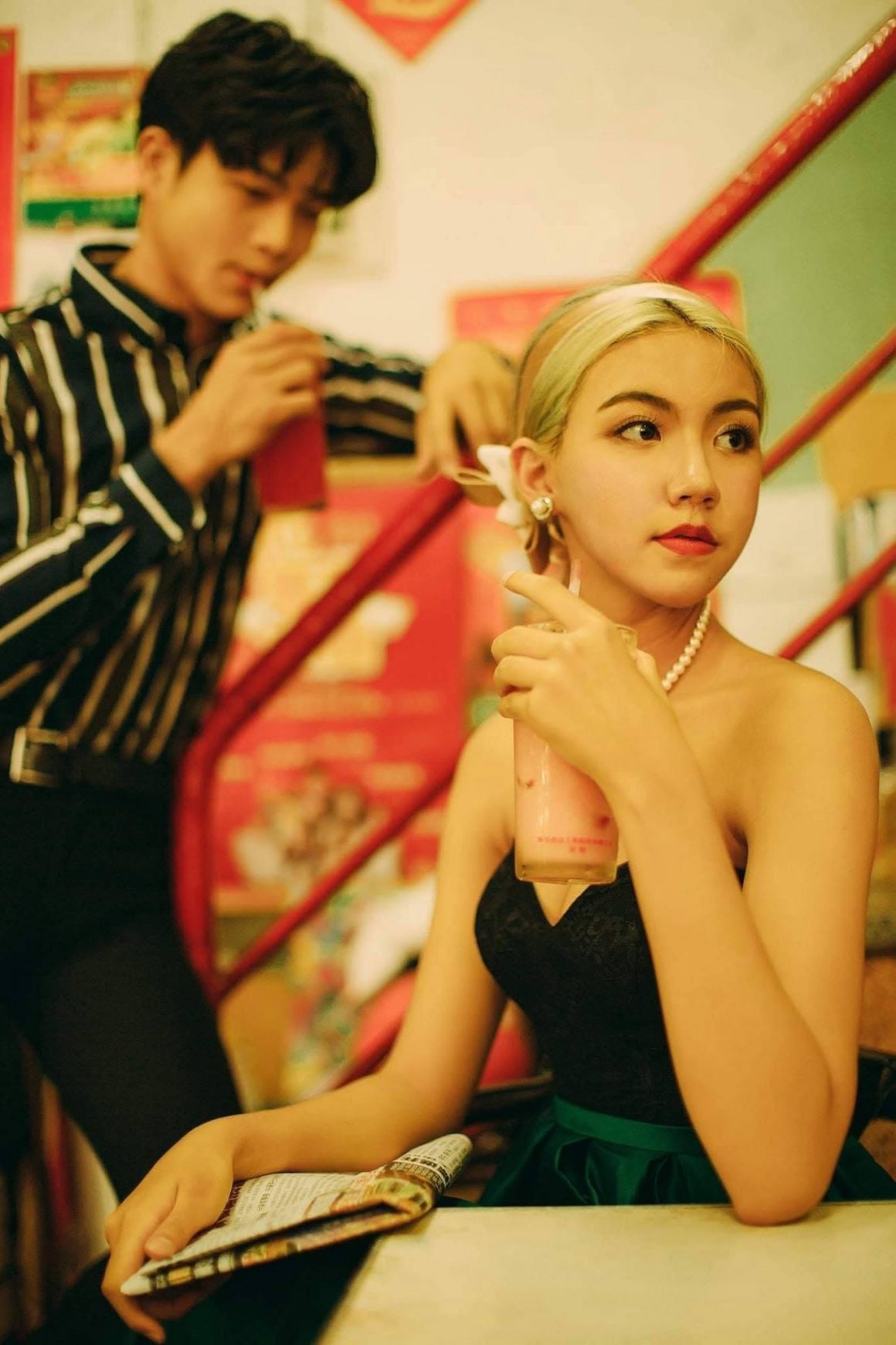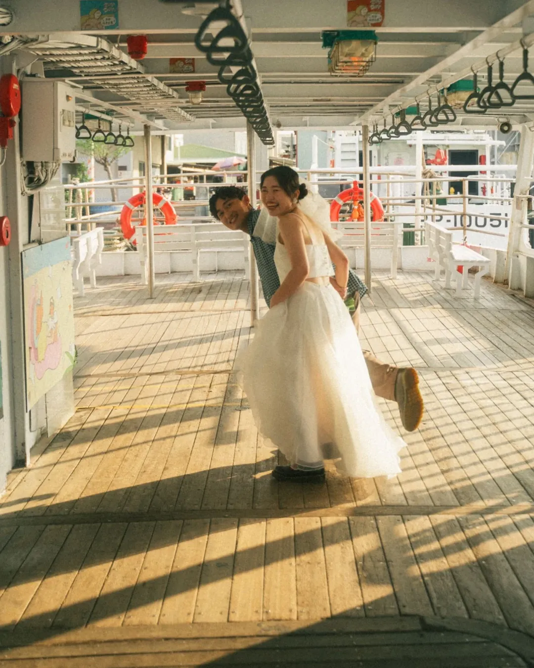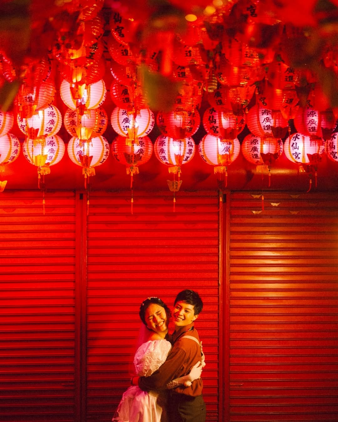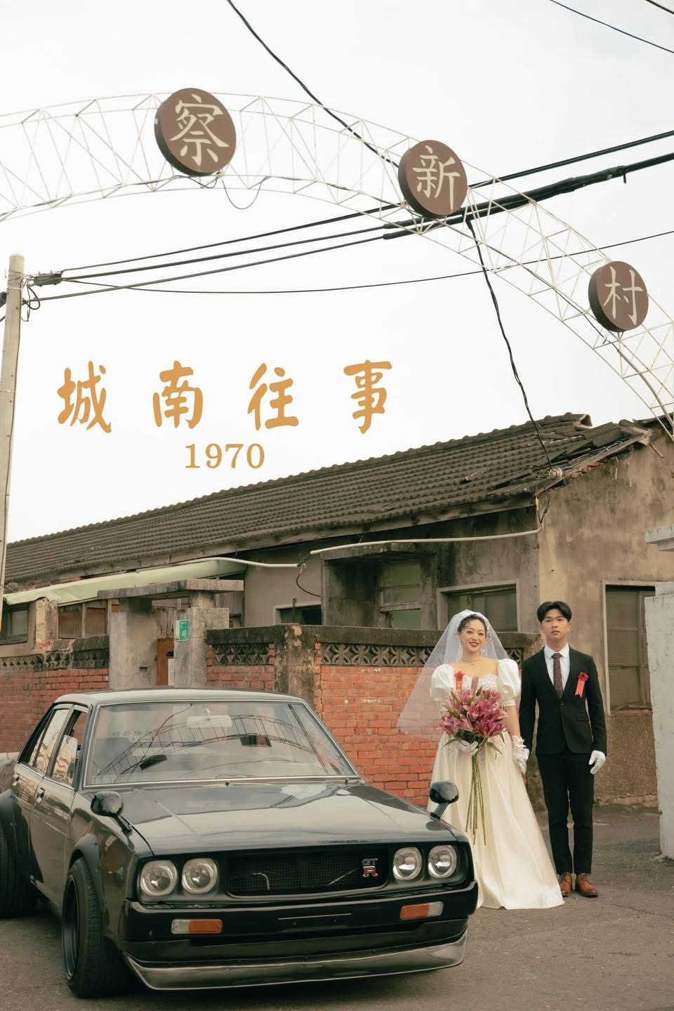 「懷舊但不老氣」就是台灣感性婚紗最迷人的調性。影像低飽和度,色調偏冷中帶暖,搭配光暈與柔焦的處理,呈現如夢似幻的柔霧朦朧感,讓畫面自然有復古氛圍。把老公寓的外牆、夜市裡的果汁攤、街角的菜市場等日常當作背景,讓新人與環境自然互動,融為一體,讓影像有種專屬台灣的生活感與人情味。