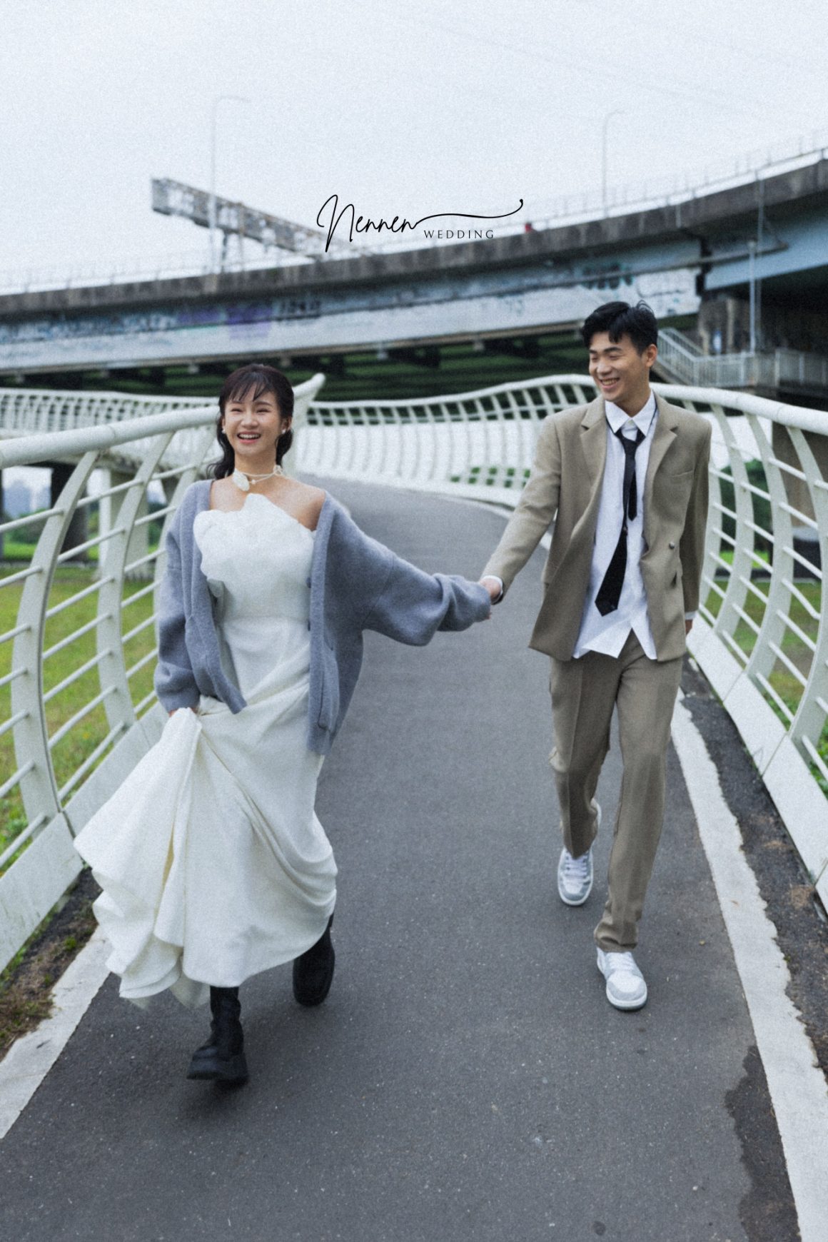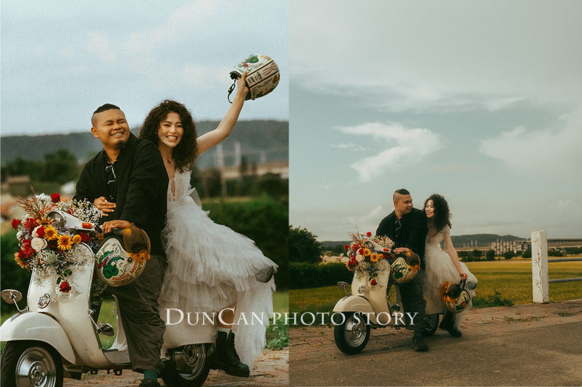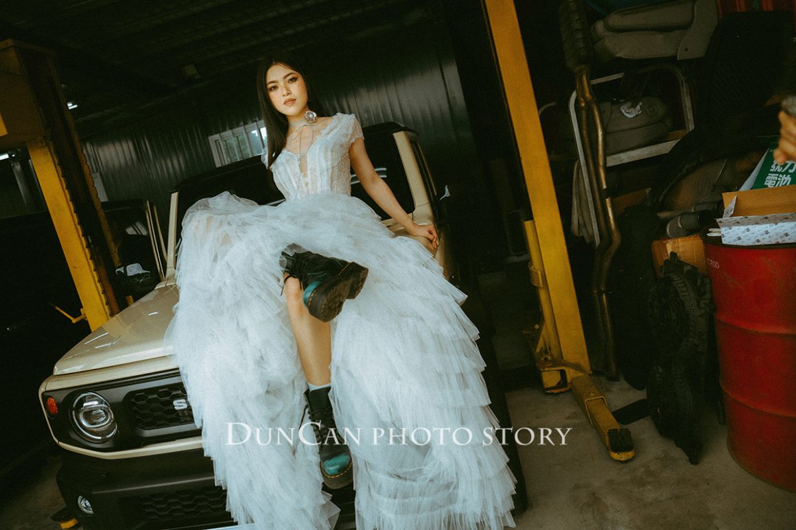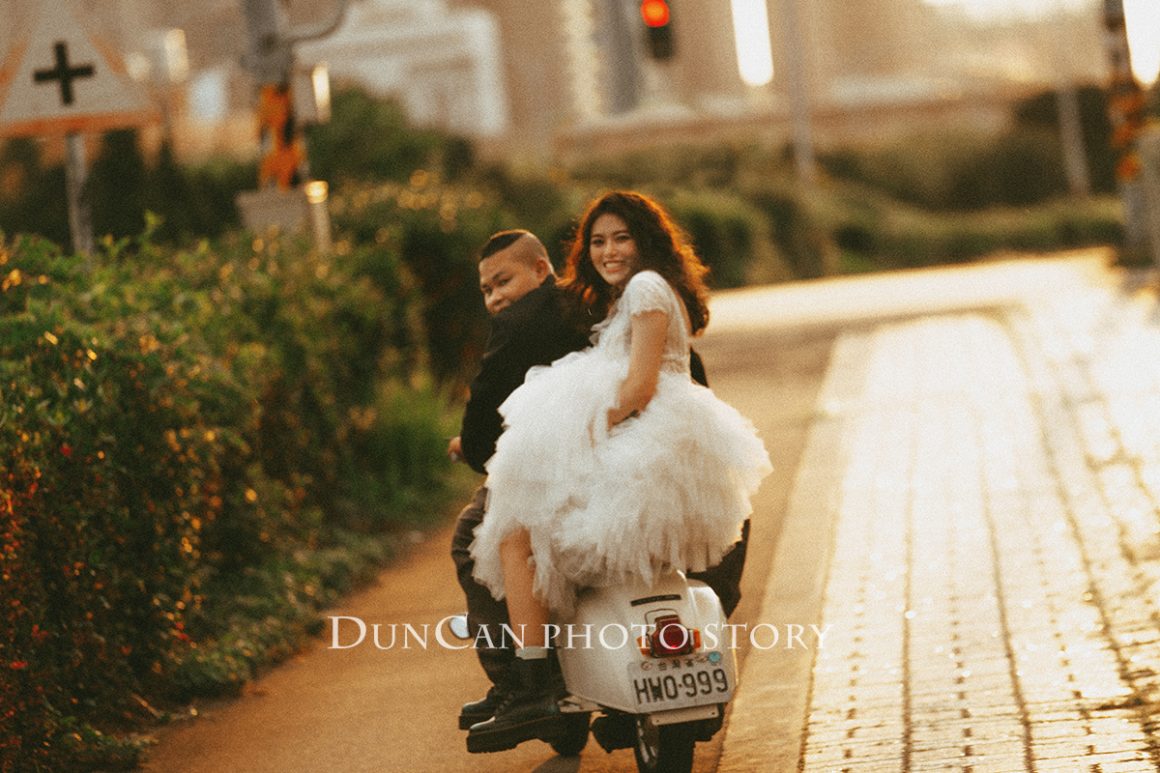 在Duncan Photo Story的鏡頭下,每張婚紗照都帶有雜誌般時尚質感和電影般動感張力,攝影風格極具敘事性與渲染力,濃郁的色調搭配巧妙的光影處理,讓畫面層次分明、立體鮮明。即使背景只是台灣日常而樸實的街景,也能完美融合浪漫與潮流,展現出專屬新人的獨特風格。