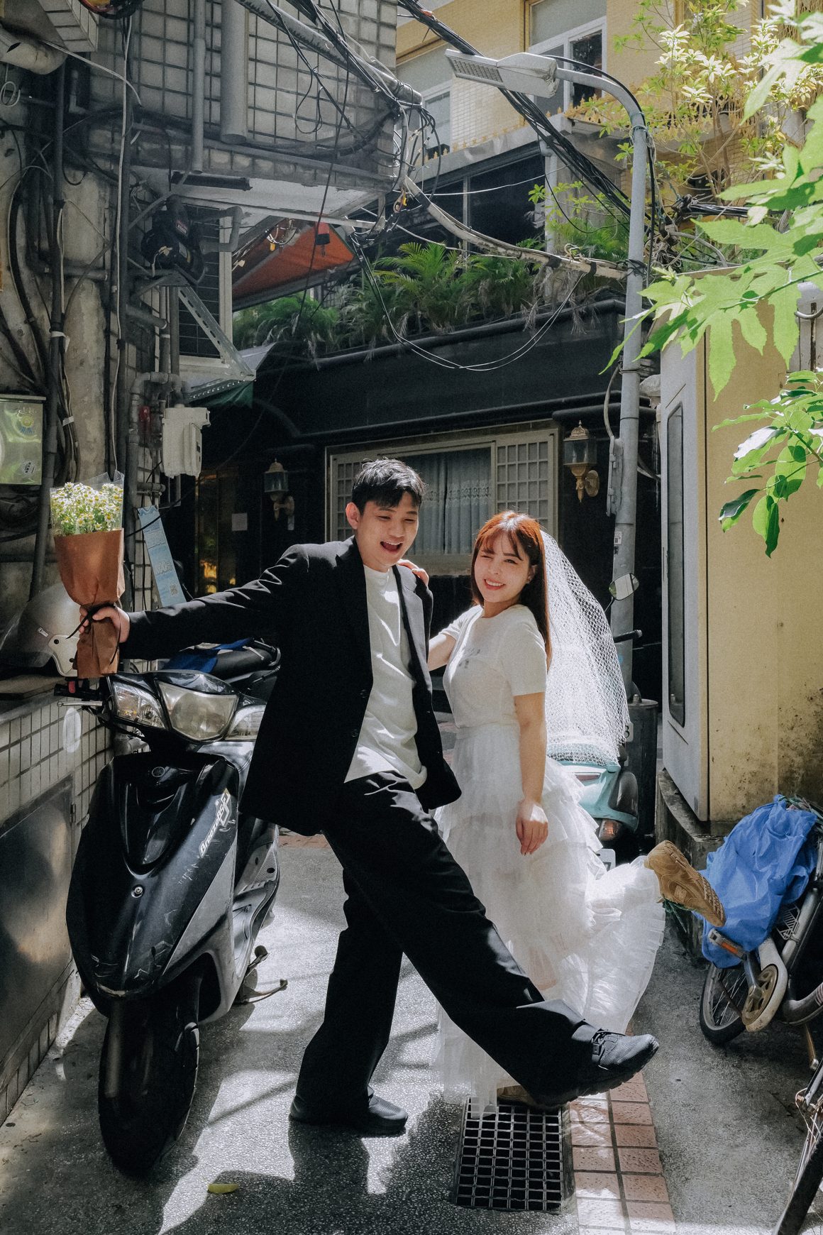 洋洋日拍擅長將婚紗與日常生活融合,作品中總能流露出自然溫暖的互動氛圍,畫面裡藏著情感和情緒。洋洋日拍攝影師在街景、老巷的日常中,運用光影與情境,讓影像不只是畫面,而是飽含溫度與在地感的愛情故事。每一張照片都像是生活中的片刻凝結,純粹平凡卻幸福動人。