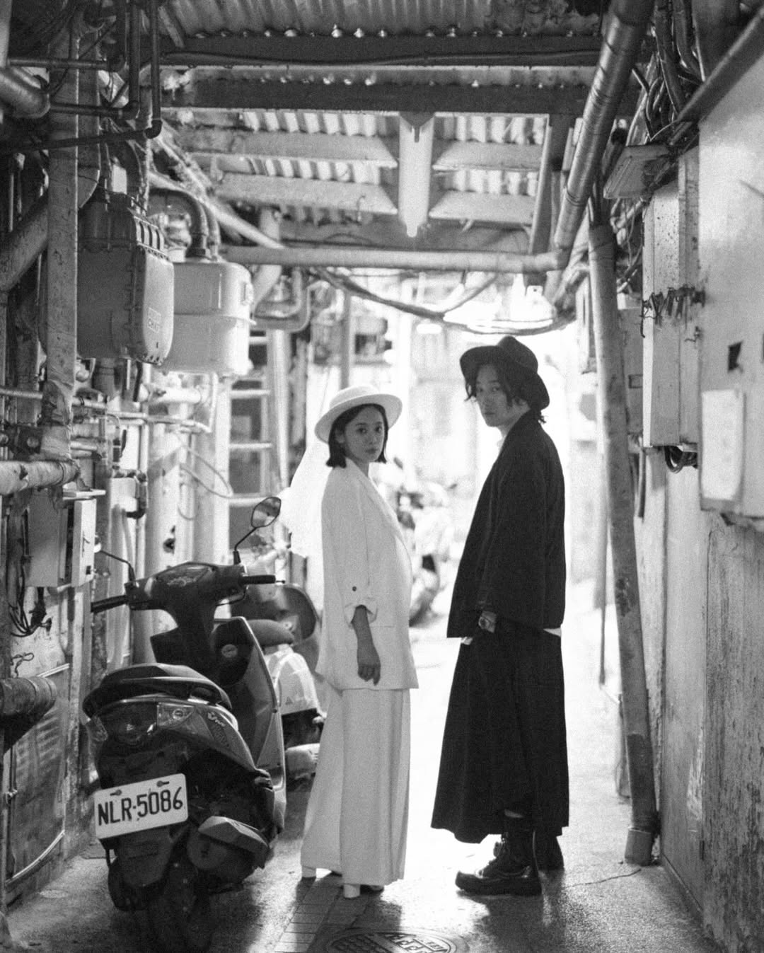 渡謙信作品不只照片風格懷舊,連新人的穿搭也十分講究。為了呈現復古氛圍,影像色調偏暖且帶有霧感,配合細膩的光線布局與構圖安排,營造出像是老電影中男女主角的畫面。