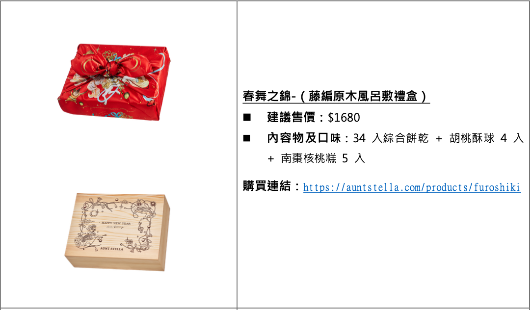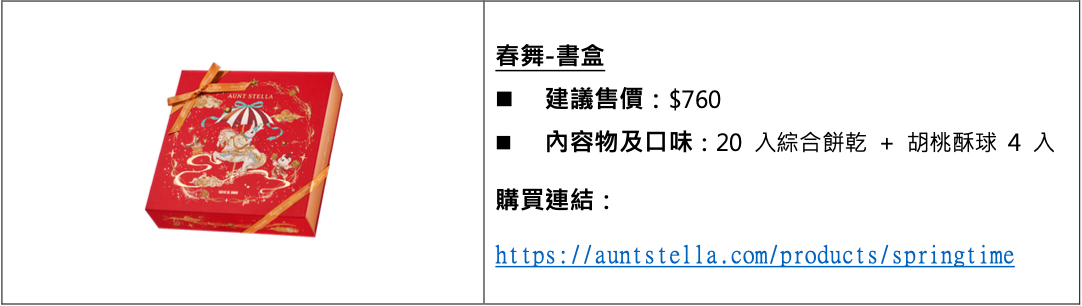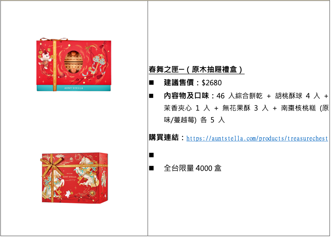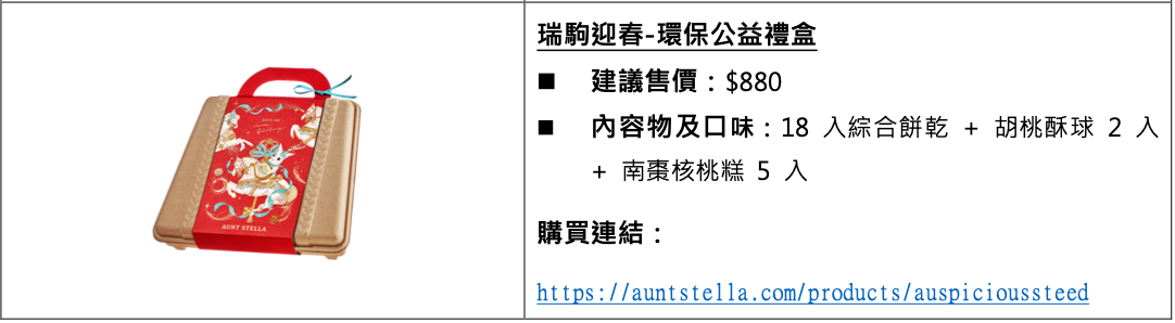 ▲ 「瑞駒迎春」、「春舞和樂」為 Aunt Stella 詩特莉與陽光基金會合作之公益禮盒,於新春佳節為收禮人獻上暖心 祝福。