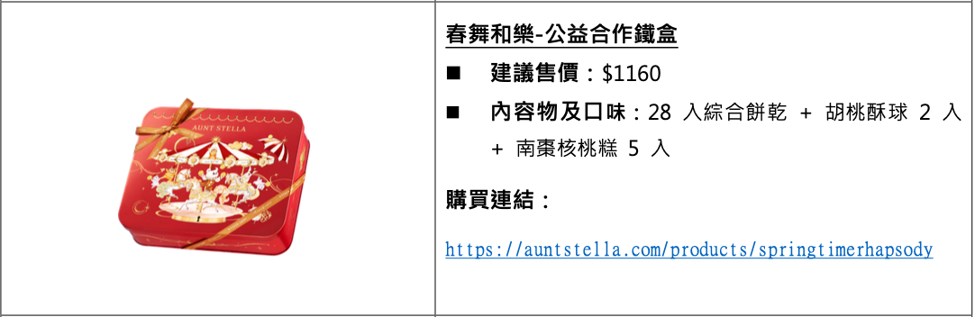 秉持「Love the planet like you love cookies」理念,Aunt Stella 詩特莉持續以行動實踐永續理 念。推出的「瑞駒迎春」環保公益禮盒,以再生紙塑製底盒、FSC 森林認證紙材與大豆油墨印刷製 成,不僅友善環境,製造過程的碳排放量甚至低於一杯市售拿鐵,展現品牌對地球永續的堅持與溫 柔關懷。同時,「瑞駒迎春」環保公益禮盒及「春舞和樂」鐵盒禮盒亦結合陽光基金會合作專案, 每售出一盒即捐出 15 元,支持「顏損弱勢家庭專案計畫」。「春舞和樂」鐵盒更特別附上由陽光 小畫家——陳依忻親手繪製的春聯,畫作以明亮色彩描繪新年幸福意象,象徵祝福、勇氣與希望隨 甜香一同傳遞。
