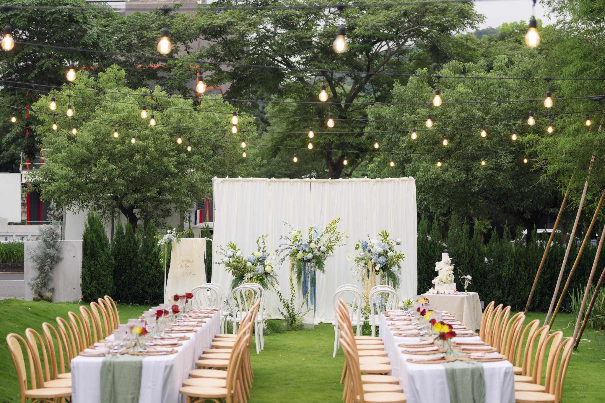 少了制式圓桌限制,除了分區規劃,也可以透過桌子排變化現場動線及畫面感,中西式長桌,或是長桌與圓桌混搭,場型運用更多元,尤其適合美式戶外場地、草地婚禮或特色私宅的小桌數婚禮場地。