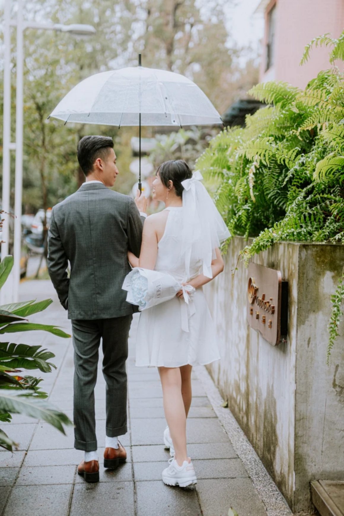 最多新人選擇的經典配法是新娘穿上一件簡單的小白裙或輕婚紗,新郎穿西裝登場,畫面乾淨、有儀式感,拍起來就像一組輕婚紗寫真。即使只是戶政事務所門口或一條普通的街景,也能拍出浪漫感。想走帥氣路線的話,情侶西裝是個很加分的選擇,整體俐落又時尚,有點韓系情侶寫真的味道,非常上鏡!
