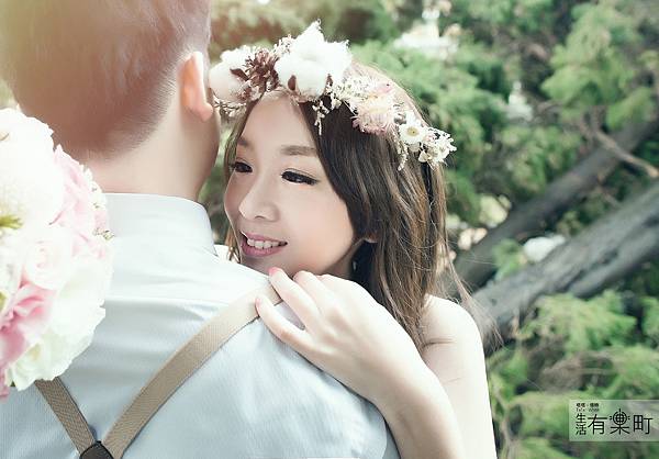 ▶妝髮造型:花圈造型,老公穿卡其色吊帶褲。