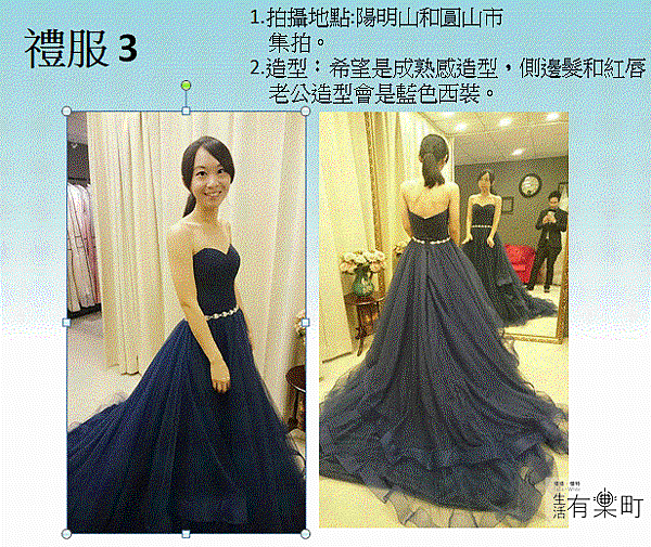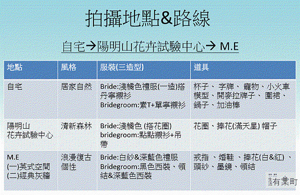 綜合拍攝地點、風格、造型與道具四樣元素整合,就可以做出像下面這張的簡易PPT,讓婚紗拍攝的想像更具體。以下就簡單分享一下我們當天的成品囉,希望可以給大家參考看看。