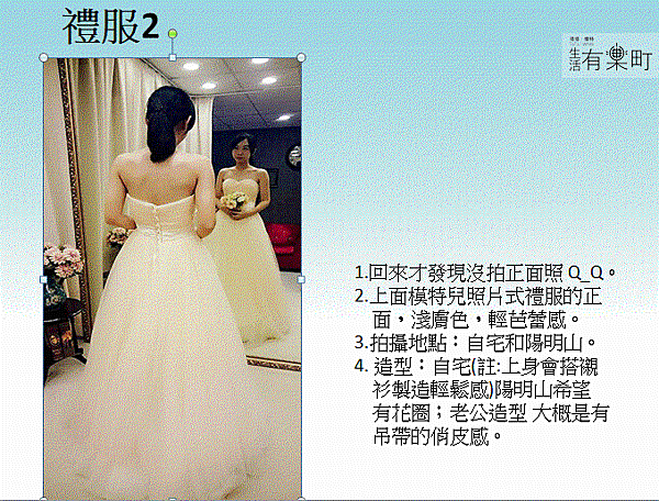 (一)婚紗拍攝ppt製作:沒有想法的時候,除了可以上網找一下喜歡的婚紗造型與風格,也可以從下面四點的準備來發想。