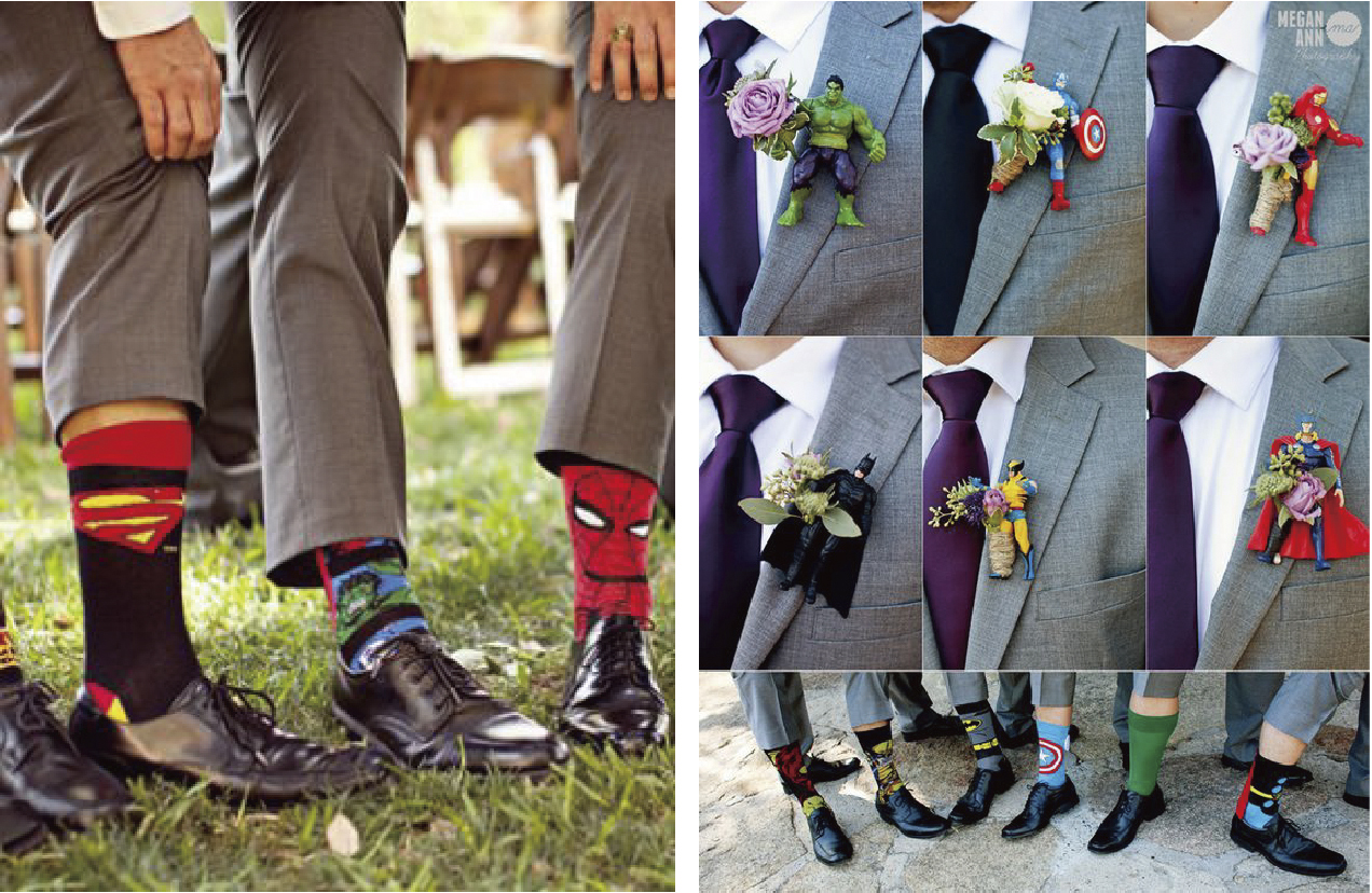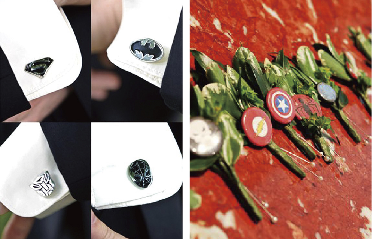 最簡單的版本,就去二手市集買個英雄公仔,或是用自己搜集的英雄,幫大家做個系列胸花吧!這時候伴郎的裝扮也可以帶點花俏,更是符合主題。