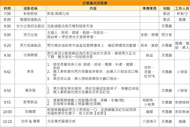 大部分飯店都有自己的流程表,後來我是依據飯店的流程表,把所有細節都寫上去。