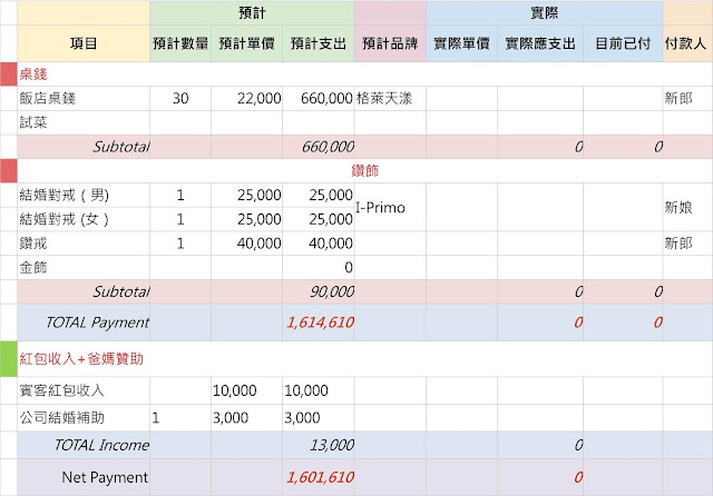 預計支出用來預估要花多少錢,我把我當初參考的金額都留下來給大家做參考。