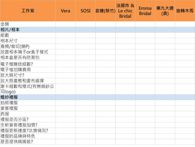 這個表格裡,蒐集所有應該詢問婚紗公司的問題,大家可以以此找出適合自己的婚紗公司和方案唷!