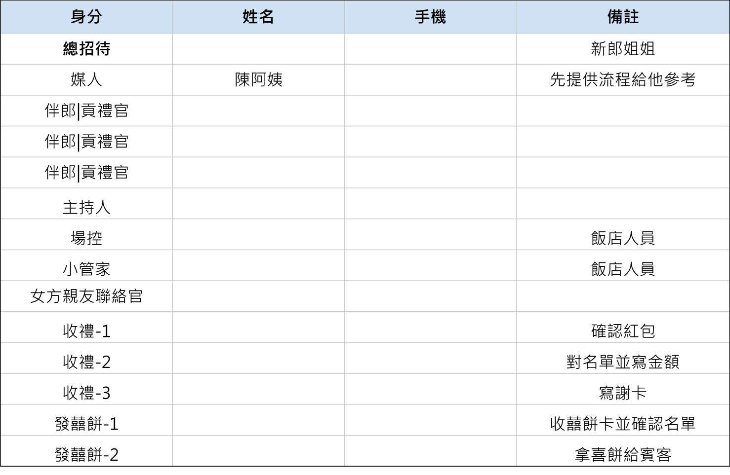 列出所有當天的工作人員和聯絡方式。婚禮當天提供給婚顧和總召,方便緊急情況時互相聯絡。