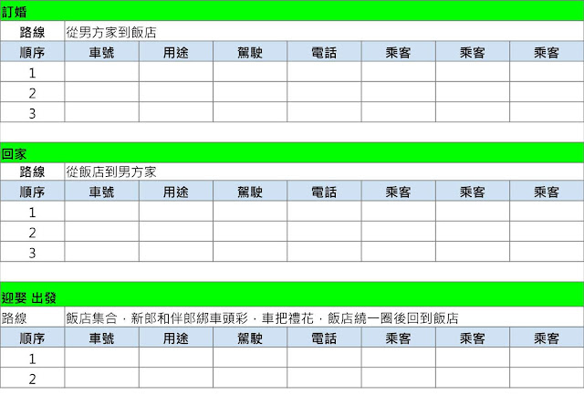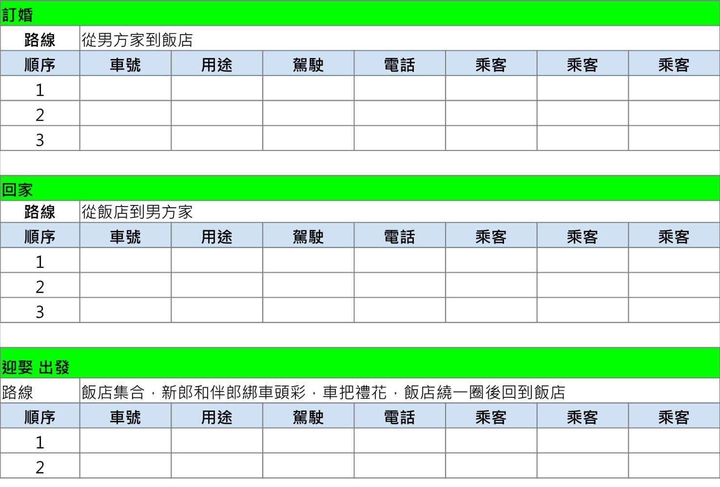 這個表格幫助大家規劃禮車的安排,可以明確的列出車次、駕駛與乘客。
