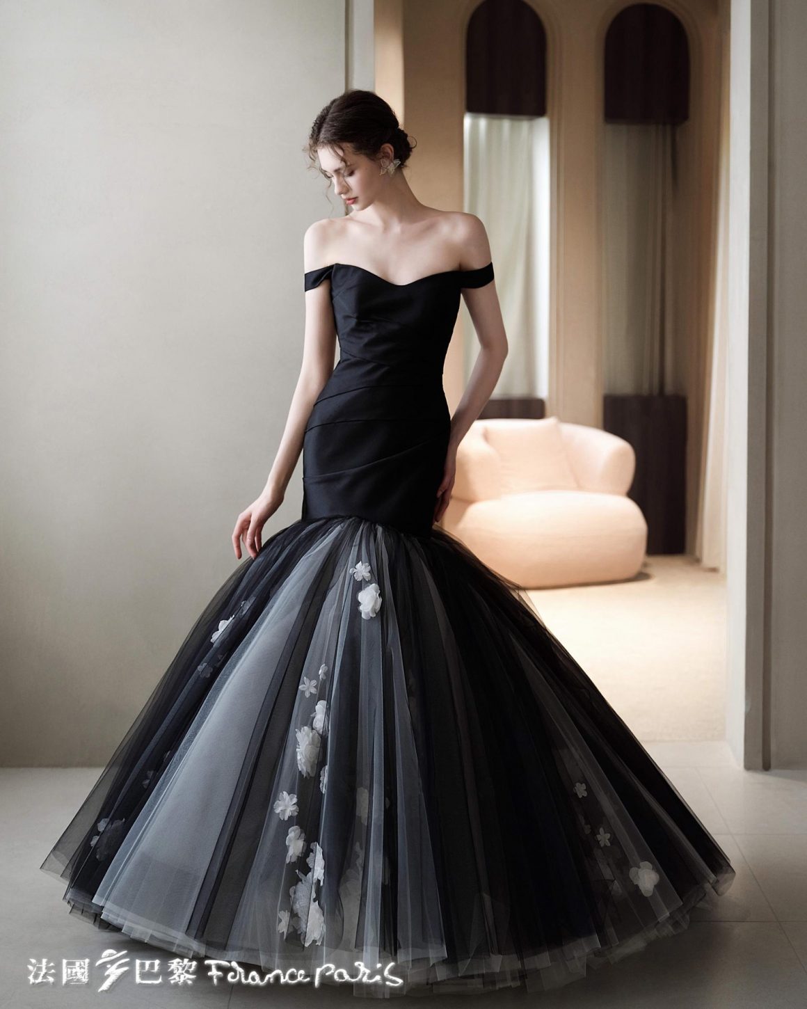 近年來一字領的黑色禮服廣受新娘喜愛,在手臂處以垂墜式或包覆式加上袖片,不僅一樣能展現新娘鎖骨及肩膀線顯條的美感,更重要的是此款式可以完美修飾手臂的蝴蝶袖,使得新娘手臂看起來更加纖細!而選擇裹臂又垂墜款的黑色婚紗或是選擇黑白相間的法式一字領,都能散發新娘高貴甜美的氣質,更是猶如皇室公主的最佳風格!