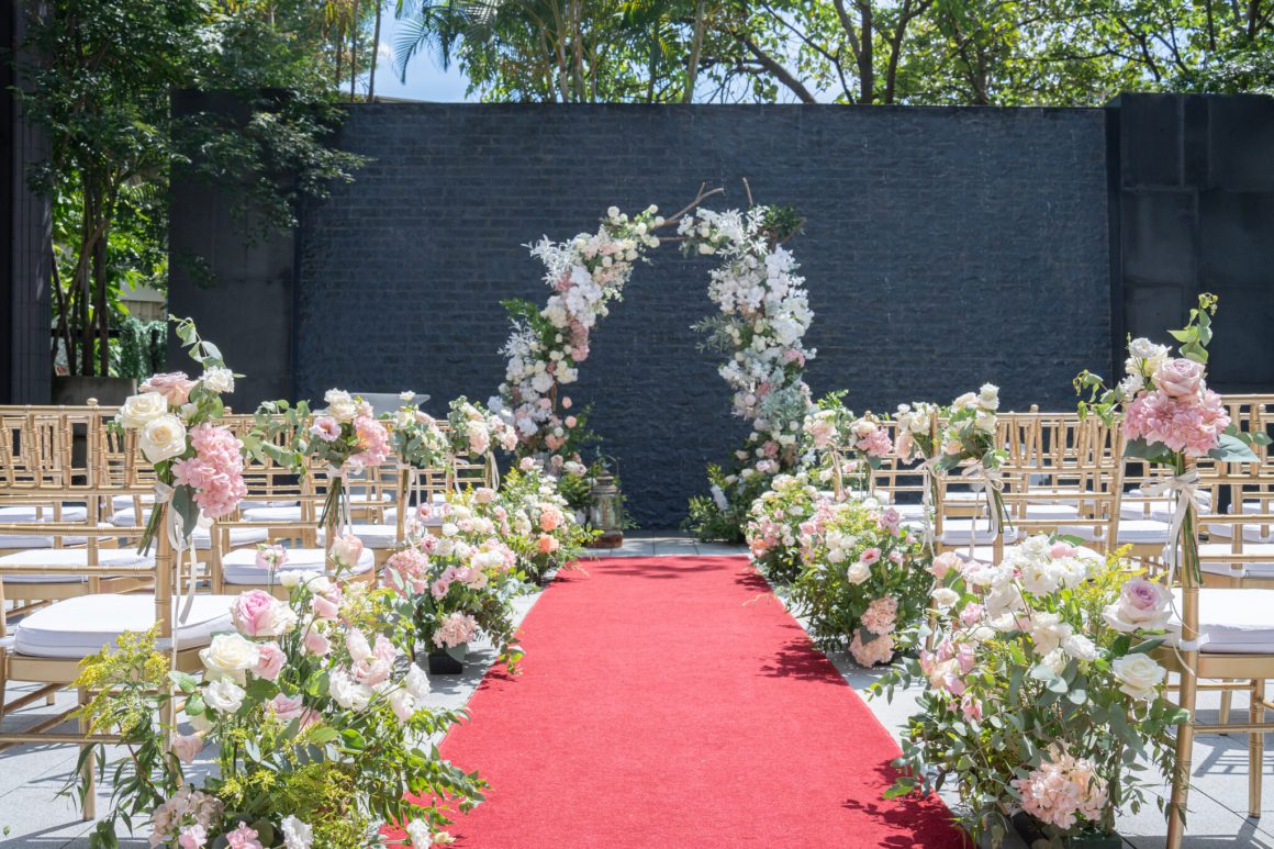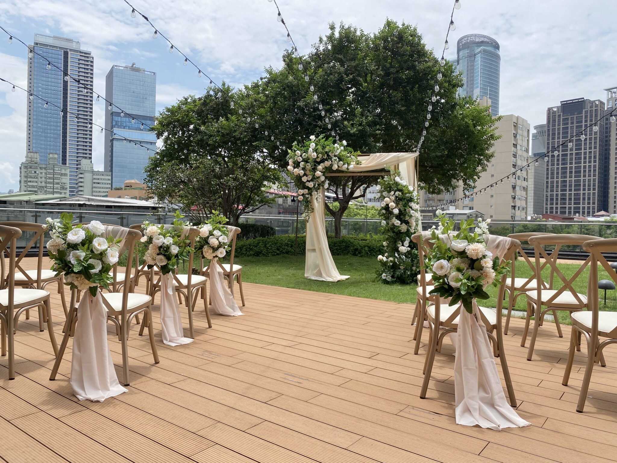 位於新北新店陽光運動公園旁,緊鄰千坪河濱綠地的【白金花園酒店 Platinum Hotel】打造五星級飯店規格的設計,都市中的一抹秘密後花園,更是許多新人挑選婚宴地點的理想飯店。 白金花園酒店 戶外庭園證婚花藝佈置