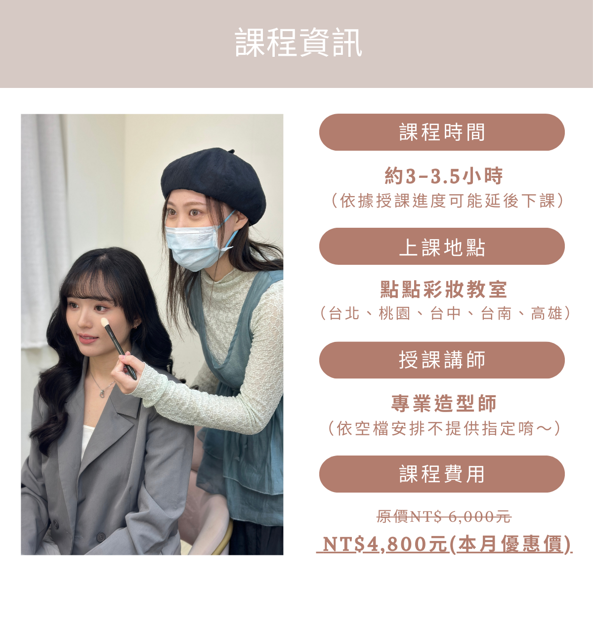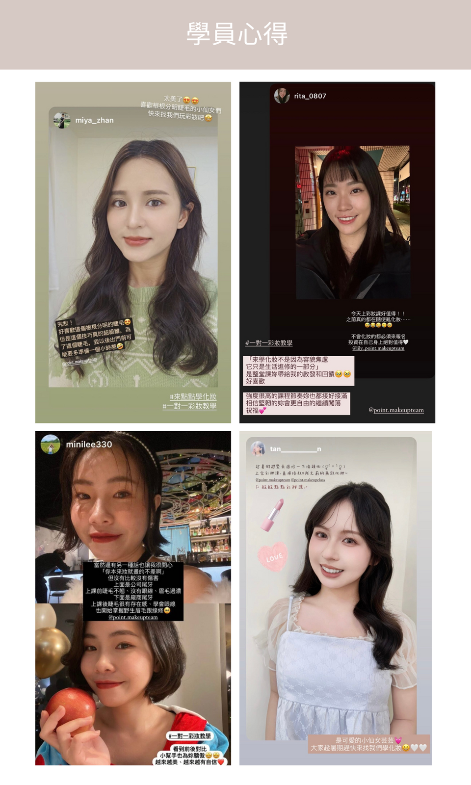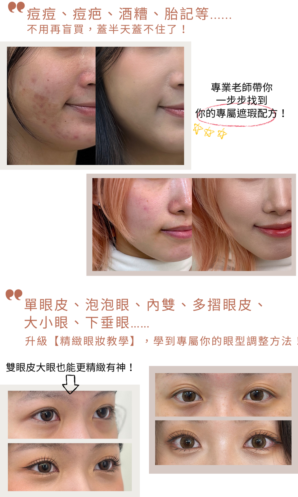 - Q1:沒有化妝品可以上課嗎? A1:可以唷!可以先借用老師的,上完課後再去購入自己真正需要產品。 - Q2:想用自己的化妝品上課可以嗎? A2:可以唷!用自己實際在用的用具學習,可以讓成果更好~有缺的用具老師也會提供建議☺️ - Q3:我真的可以在一堂課內學會嗎? A3:當然可以呀❤️不用擔心!上課進方式是【老師示範+學生實作】直接在妳的臉上教學,每個步驟都會手把手帶妳操作。 當然回家一定也要多練習,才能真正熟練唷💪💪 - Q4:不小心睡過頭上課遲到怎麼辦? A4:上課請務必準時抵達哦😭😭 若遲到需自行承擔課程時數不足的狀況,超過15分鐘以上會酌收等待服務費的QQ請大家多多注意! - Q5:請問報名後突然有事可以改期嗎? A5:因為1對1課程都是特別為你留下檔期時間🥺 為避免影響其他水水的報名權益,上課前24小時內因個人因素改期,會酌收改期費的😢 請大家報名後務必準時抵達! -