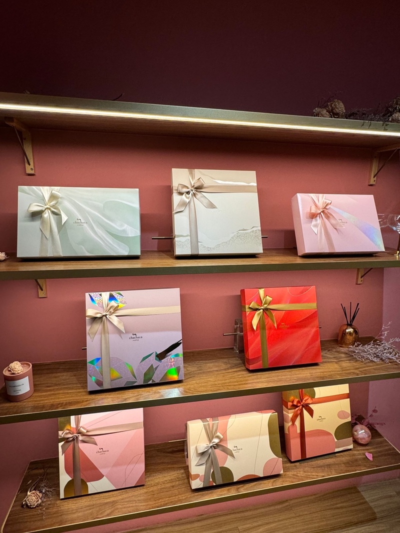 在網路上挑選了幾間網友推薦和喜歡的包裝做篩選。假日約了兩間喜餅試吃,第一間約了 Chochoco 大安店,試吃會收試吃費,不過如果最後有下訂的話可完全折抵,假日人潮絡繹不絕,看來挺受新人歡迎的。