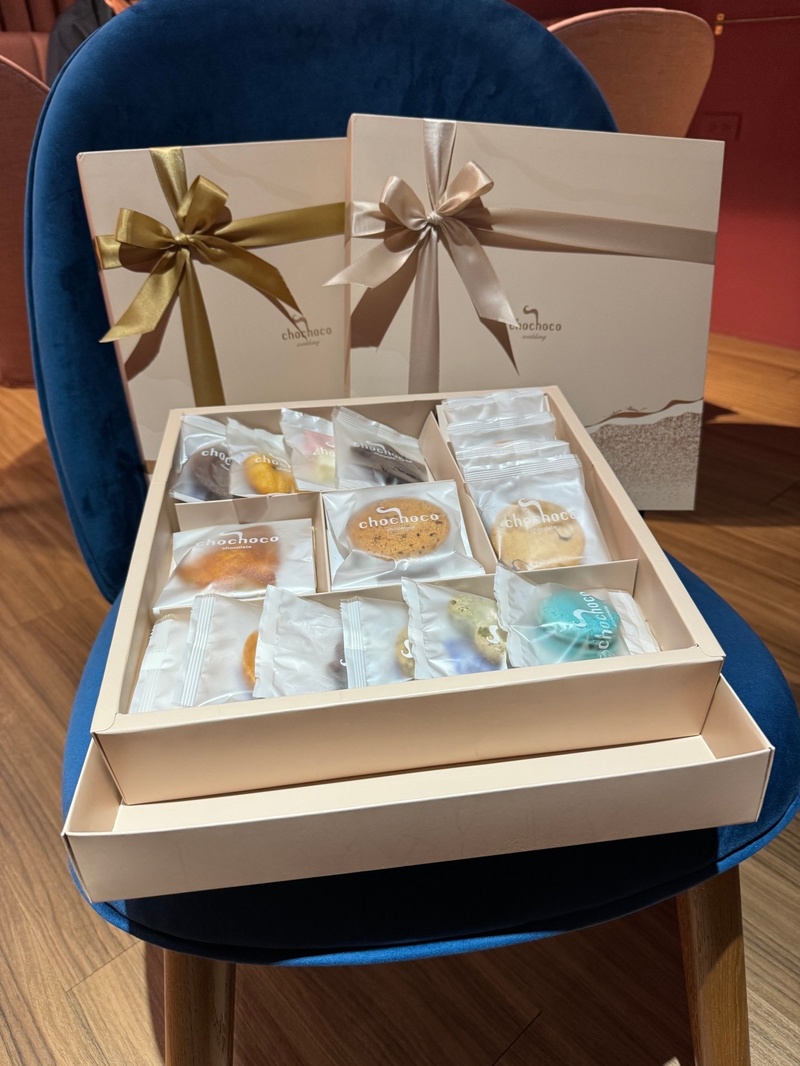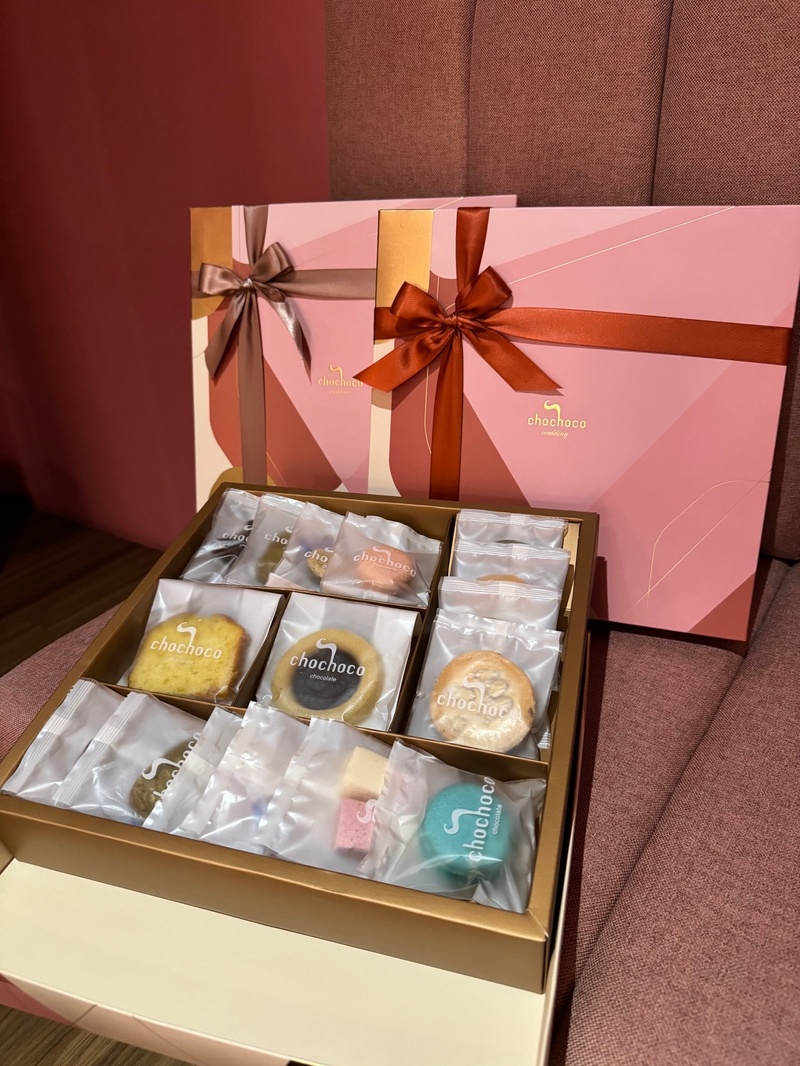期待的試吃喜餅環節來了,先說結論最後選了 Chochoco 擁抱時刻16組搭配紅色緞帶。