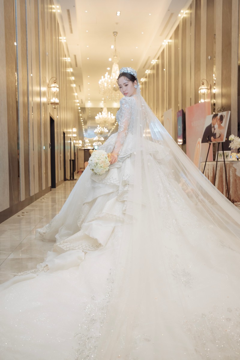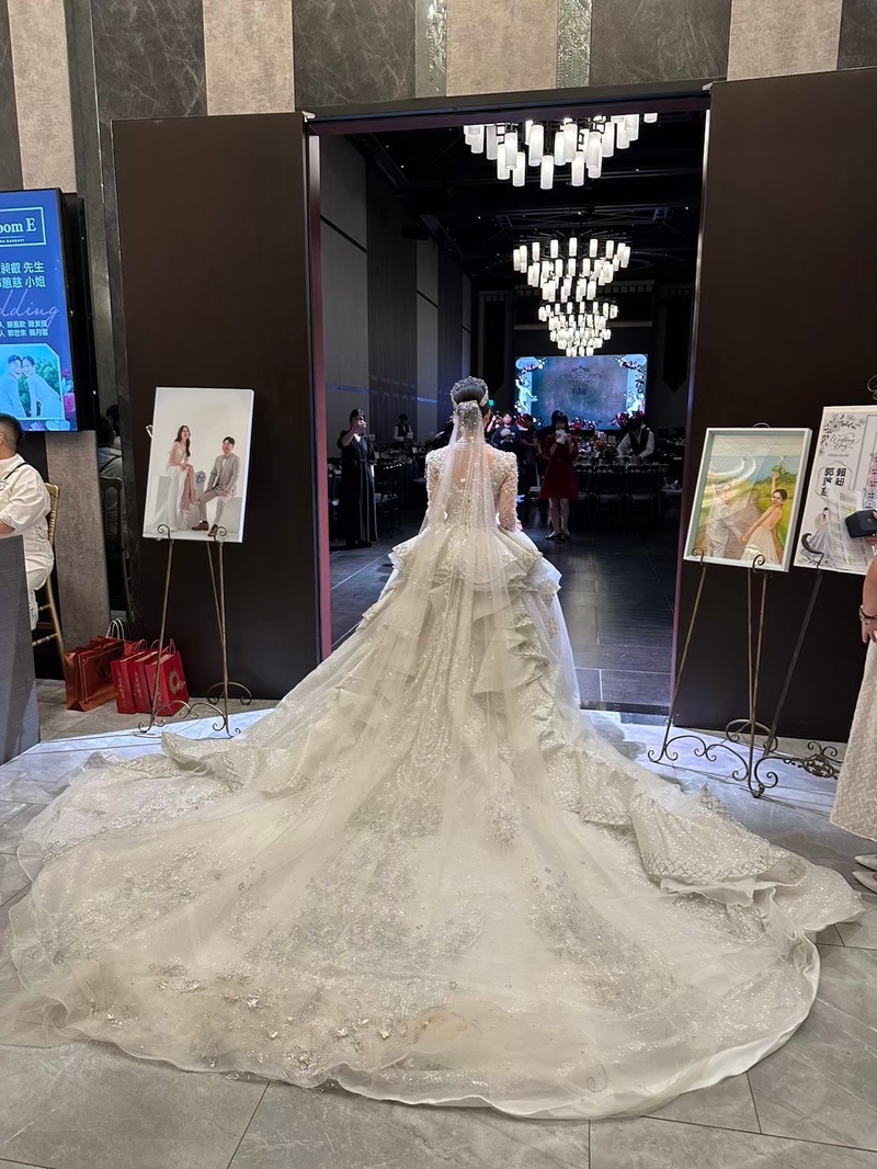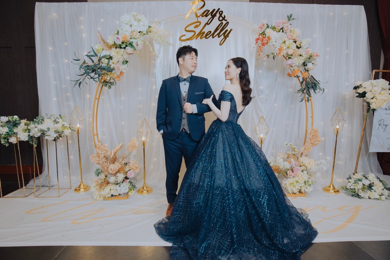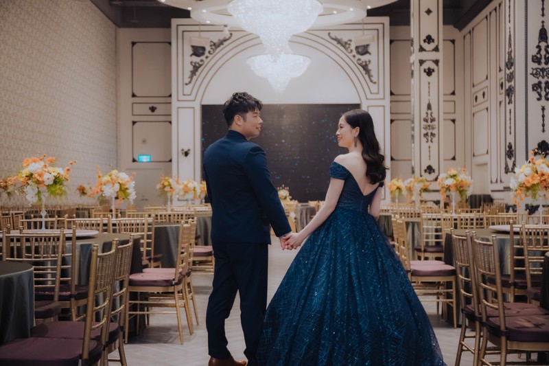 彭園一共有7廳,個人覺得最美也最搶手的就是夢幻浪漫聖潔純白的A廳,如果是好日子很難搶到,我們一年前來訂也沒訂到,建議如果喜歡的話,一年半甚至兩年前就可以來詢問,後來我們是訂古典宮廷風E廳,廳內有華麗氣派感,專屬的廳內燈光秀對婚禮開場也非常加分,缺點是場地整體偏暗(地板也是黑磁磚),會比較考驗攝影老師的技術,但相對的白紗或淺色禮服會很醒目,另外受限場地因素,送客背板區一般會建議設在廳內。