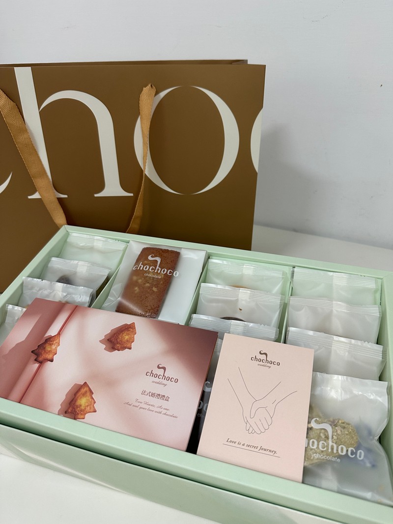 因為婆婆從以前就會買chochoco的巧克力回家、我自己親姐姐表示這家喜餅收過印象不錯(只記得口味很多元),其實這兩個答案後我也都只爬文chochoco 的評價😂,似乎都沒有看到壞的,反而被大家極推的14入,小島時秘境禮盒推坑了,不得不說真的盒子擺放起來不會很空虛感,袋子也是有種精品包的紙袋一樣!