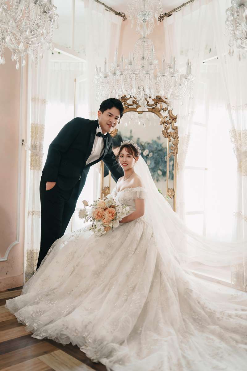 到了拍攝當天,化妝師很細心的一直重複的在調整我的眼睛(本人是單眼皮加上雙眼皮貼超難貼),真的很讚,把我畫的美美的,整體造型我們都很滿意,拍攝當下攝影師會引導如何擺姿勢,全程也會以逗趣的的方式引導我們的笑容等等,整個拍攝過程非常歡樂,最後到了最期待的日子!挑片!只有讚嘆可以形容,有選擇障礙的我每張都想要,但這裡不用擔心,本身自己挑選的50組照片,拍攝度照片會全部給新人,真的超讚!