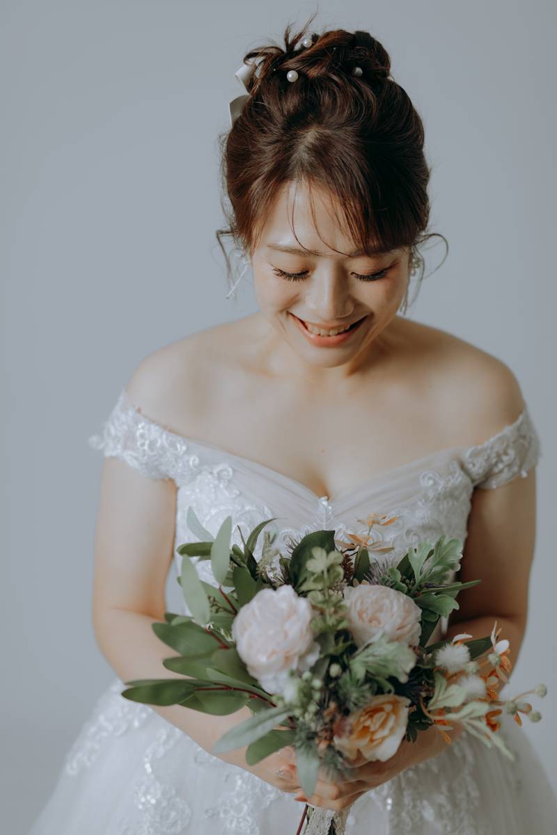 另外要感謝的是造型師靜儀,造型的部分幫我設計成可愛又甜美的風格。老師也很親切,還在造型與拍攝的當下一同與攝影師KK營造出輕鬆的氛圍,讓我和先生順利完成拍照。