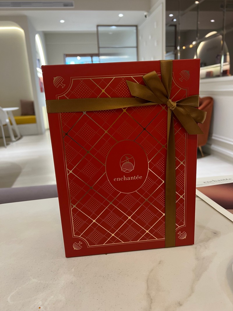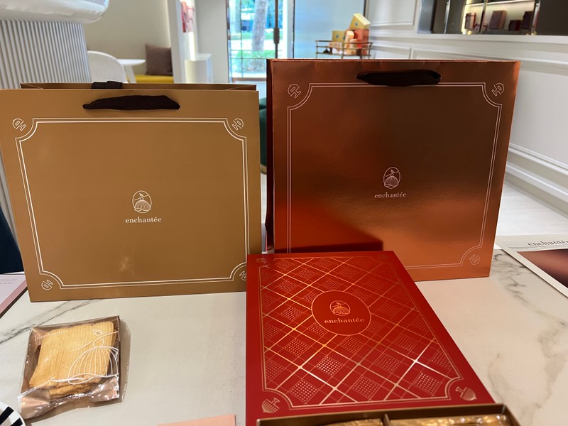 最後,在眾多喜餅禮盒中,我們試吃當天就下訂選擇了「法式菱格紋禮盒」。這款禮盒的外觀設計非常吸睛,紅色菱格紋象徵著喜氣與華麗,摸起來也有著高級布料的觸感,整體質感非常優雅高貴。搭配的古銅金色紙袋也非常有設計感,不僅提升整體的質感,也讓收到的人感受到滿滿的用心與祝福。
