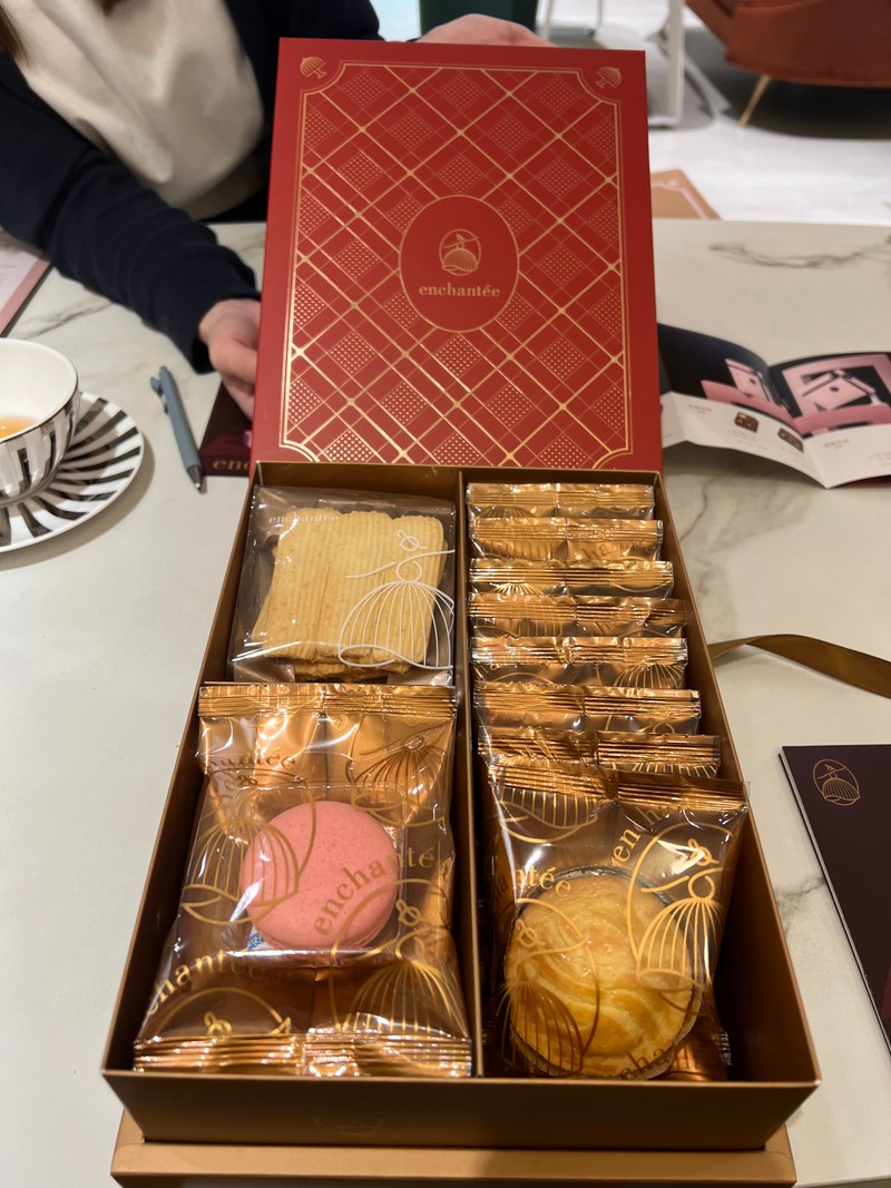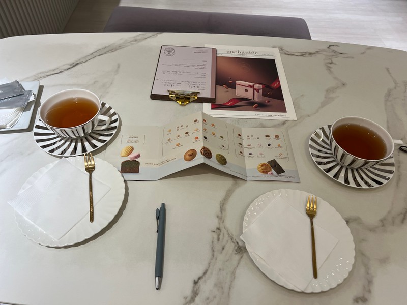 試吃區的設計也十分貼心,有舒適的沙發座位,讓人可以安穩地坐下來慢慢品嚐點心。這裡不像一般餅乾試吃那樣倉促簡單,而是像在一間安靜的小咖啡廳裡享用下午茶,氣氛非常舒服。服務人員態度親切,會發一張喜餅口味型錄可以一邊做筆記,也會細心介紹每一款點心的特色與口感,讓人感覺備受尊重與照顧。
