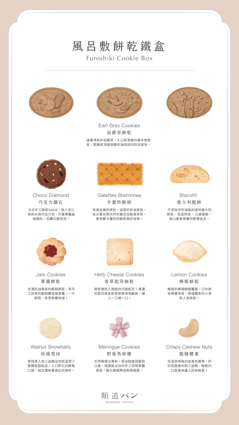 在試吃的時候 風呂敷禮盒的時候大家搶太快就沒有拍到照片(不然包裝真的很美)放上官網的示意圖,一開始擔心會很甜很膩口,但是表現很出乎意料,像是檸檬餅乾有驚艷到我,雖然上面覆蓋檸檬糖霜 ,但是一點都不甜膩,也不是那種刺激的檸檬味,反而清清淡淡的很清爽,還有伯爵茶口味,雖然一開始覺得很普通,但是後面的尾韻很香,家人們反而對那樣餅乾印象深刻,還有果醬餅乾大家也都讚譽有加,總之禮盒裡面我吃起來都沒有地雷,覺得可惜的部分,是不能挑選餅乾,讓喜歡的餅乾多一點(可能因為空間的關係),比較怕的是在運送的部分餅乾會碎掉與可能餅乾放在一起久了,味道會比較混雜,但目前還沒試過。