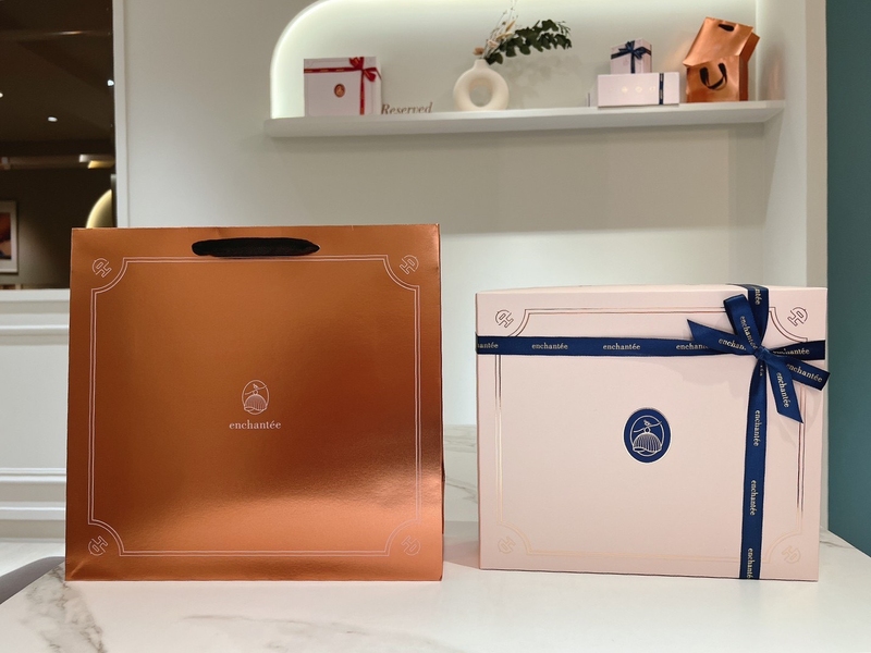 禮盒樣式雖然沒有很多,但每個都有自己的特色,我們鎖定在16入,猶豫很久,原本想選雙層的優雅星芒,但老公偏向單層,因為送長輩居多,要第一眼看到就很大方有份量,所以最後我們選擇的是頂級系列湛藍跟彤粉16入,緞帶的部分藍色有一種高貴感,紅色則是很有質感又喜氣的紅,不是俗氣的紅,緞帶顏色都太美了很難抉擇,還好服務人員說可以各半,我們二話不說直接說那就兩種都要了!提袋選擇最閃亮的古銅金,跟外面一般金色提袋不一樣,樂朗奇連提袋都是低調奢華感,送出去會非常有面子也顯得很有品味😍