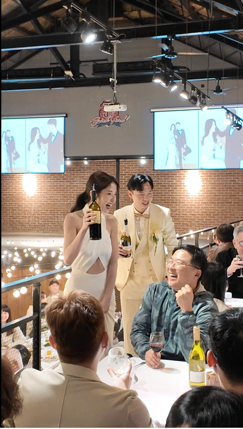 晚宴流程中安排了許多互動遊戲,是這場婚禮最受賓客稱讚的部分。我們二次進場是用「拉酒嘴」方式入場,賓客立刻被帶進歡樂氛圍。接著進行了「Shoe Game」——這部分我們事前就有跟想樂團隊溝通,希望由他們全權出題,我們同意可以包含一點16禁的趣味題目,但特別要求:題目不要提前透露給我們!當天真的每一題都讓我們驚喜不斷(甚至有點害羞),答案一致時全場歡笑,答案不一致時就直接剪刀石頭布決勝負,現場的互動感與臨場反應超真實,也讓賓客看得非常開心。