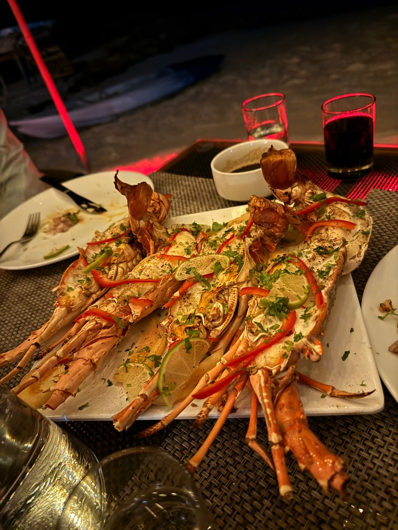 到了馬爾地夫的Fulidhoo沈船浮潛點,看著蔚藍水面下五彩繽紛的魚群悠遊,以及與溫馴的護士鯊共遊,真的是很難得的體驗!晚餐在沙灘上的龍蝦大餐,真的是大飽口福~😋