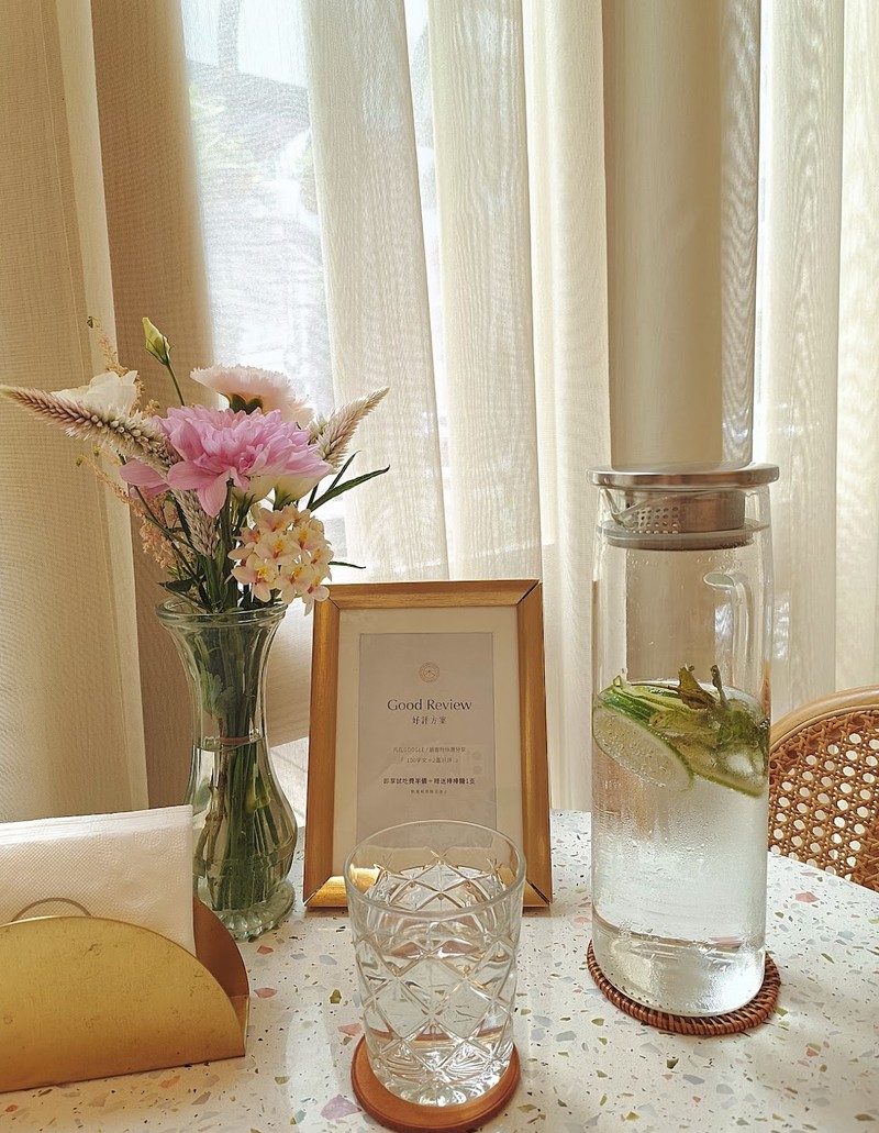 桌上有準備水而且是氣泡水耶,裡面還加了迷迭香和薄荷葉還有檸檬片~冰冰涼涼的好清爽!