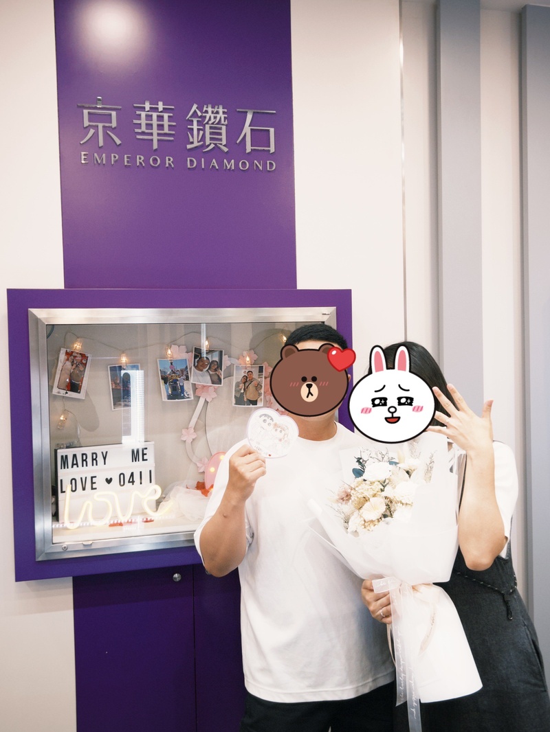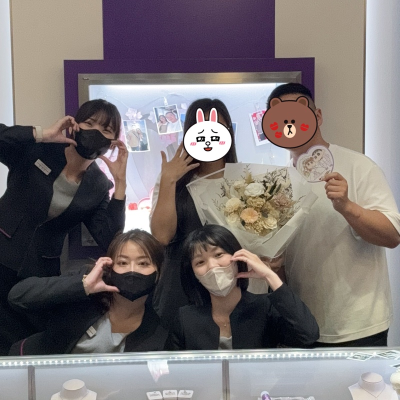 當天拿戒指時,看著先生說要去借廁所,後面想說怎麼那麼久還沒出來,結果原來是和店員們串通好要給我求婚驚喜~